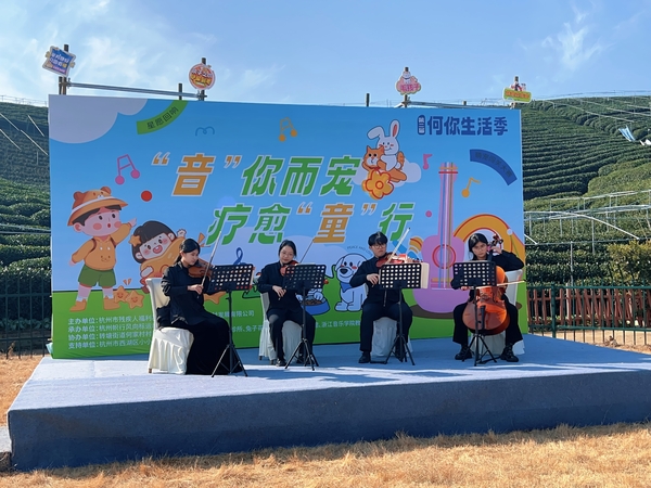 同期,“音画漫游”音乐艺术展也在西湖景区、之江文化中心、龙坞茶园和欧文幼儿园等地同步呈现。艺术展创新整合学院研究生处青年教师田震坤的“漫话音乐家”系列漫画作品与管弦系学生室内乐团、附属音乐学校舞蹈团和国乐团演出,通过音乐演绎、视觉漫画、声音装置与疗愈场景构建多感官视听联觉体验,将音乐的情绪调节功能与心理疗愈价值具象化,进一步延展“音乐疗愈”项目在跨媒介表达上的探索创新。此举不仅为学生搭建真实艺术实践平台,更实现“以演促学、以行促创、以服促教”的美育闭环。