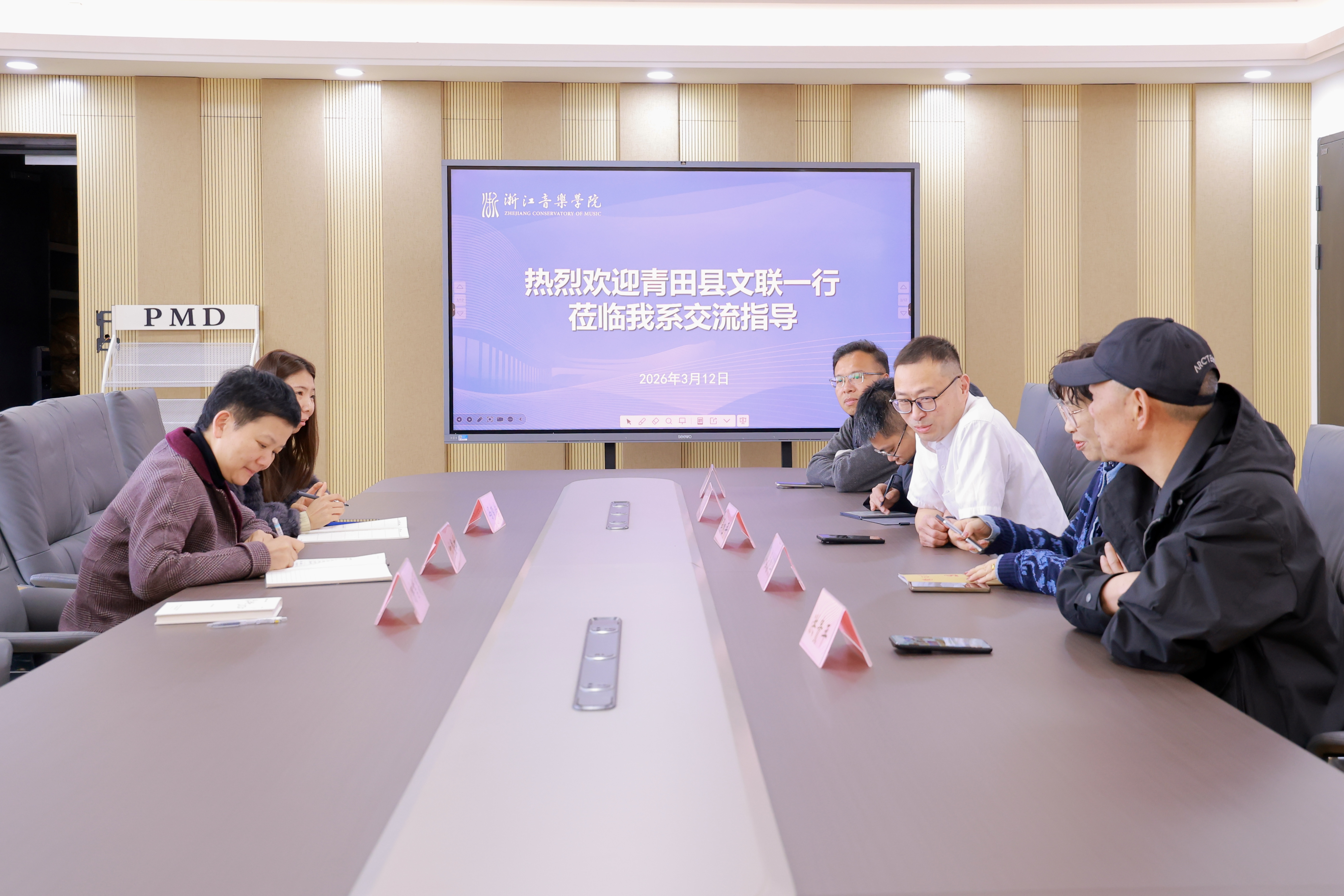 随后的交流会上,双方围绕“校地合作”这一核心主题,深入探讨了在社会实践、音乐教育与文化交流等领域的合作前景,并期待师生积极参与青田县特别是千峡湖、北山镇等地区的文化建设活动,在双向奔赴中实现艺术实践与教育相长。