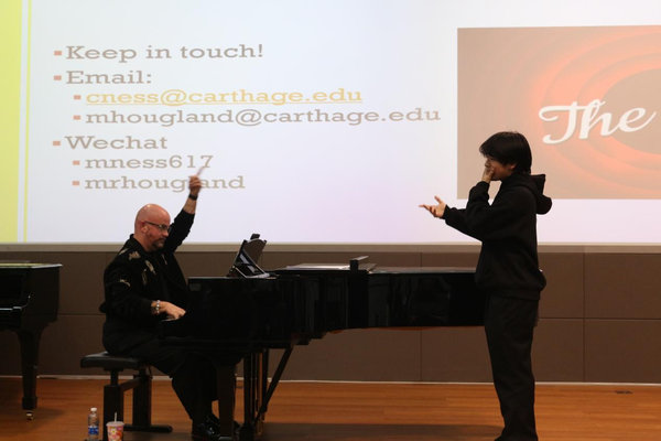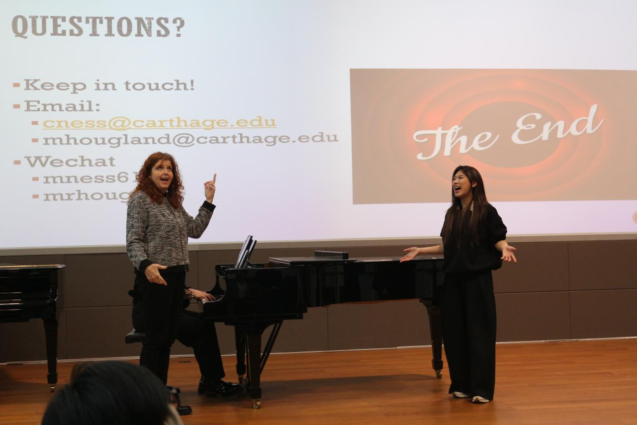 作为当代声乐教育领域的权威学者,科琳·内斯教授开启互动工作坊,围绕学生声乐学习痛点展开现场演示与精准指导,深度解析国际声乐训练体系的核心技巧。同时结合自身在美国、中国等多地的教学实践经验,反复强调“歌唱的本质是叙事”,将声乐技巧与戏剧行动紧密结合。马修·霍格兰教授则从口腔内部构造为切入点,清晰讲述了歌唱中口腔的运作机制,用幽默的语言将现场气氛推向高潮。在最后的互动环节,两位教授紧扣音乐剧声乐技巧与戏剧行动的教学核心,现场引导学生现场互动,让师生在沉浸式教学中获得直观感受,收获颇丰。