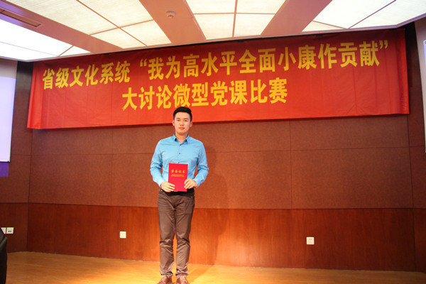 4月27日,省文化厅举办的省级文化系统“我为高水平全面小康作贡献”大讨论微型党课比赛,我院青年党员教师张正元演讲的微型党课《走前列,谋新篇》荣获优胜奖。本次比赛共有来自各省直单位的22名选手参赛。经过激烈的角逐,得分最高的5名选手获得“优胜奖”。