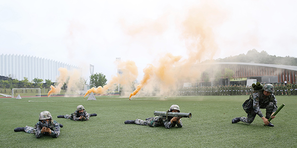 分列式结束后,舞蹈系2016级学生表演了别具一格的军体操,军体操中巧妙融入了舞蹈元素,刚柔并济、精彩纷呈。承训教官们进行战术基本动作表演,他们装备整齐、行进有序,在滚滚硝烟中穿越火圈、匍匐前进、突破障碍,体现了军人纪律严明、英勇善战的坚毅品格。
