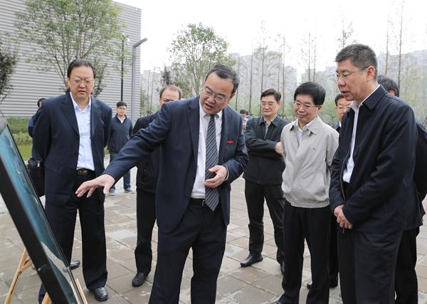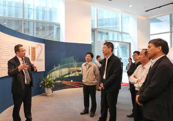 张复明一行参观了学院校区环境,考察了大剧院、音乐厅、学生琴房等教学设施,对我院建设和发展取得的成绩给予了充分肯定。在南门,张复明仔细研究了学院的鸟瞰图,听取了褚子育对学院筹建思路与路径、基本概况和发展愿景的汇报,对高品位的设计理念、高效率的建设速度、高标准的工程质量、高起点的校园环境给予高度评价。在校史馆,褚子育重点介绍了学院的内涵建设,详细讲解了学院的办学特色、师资队伍、招生和教学情况。张复明表示,浙江省委省政府高度重视,把浙江音乐学院建设 “放在心上、抓在手里”,学院拥有优越的硬件设计和强有力的教师队伍,一定能成为高水平一流音乐学院。