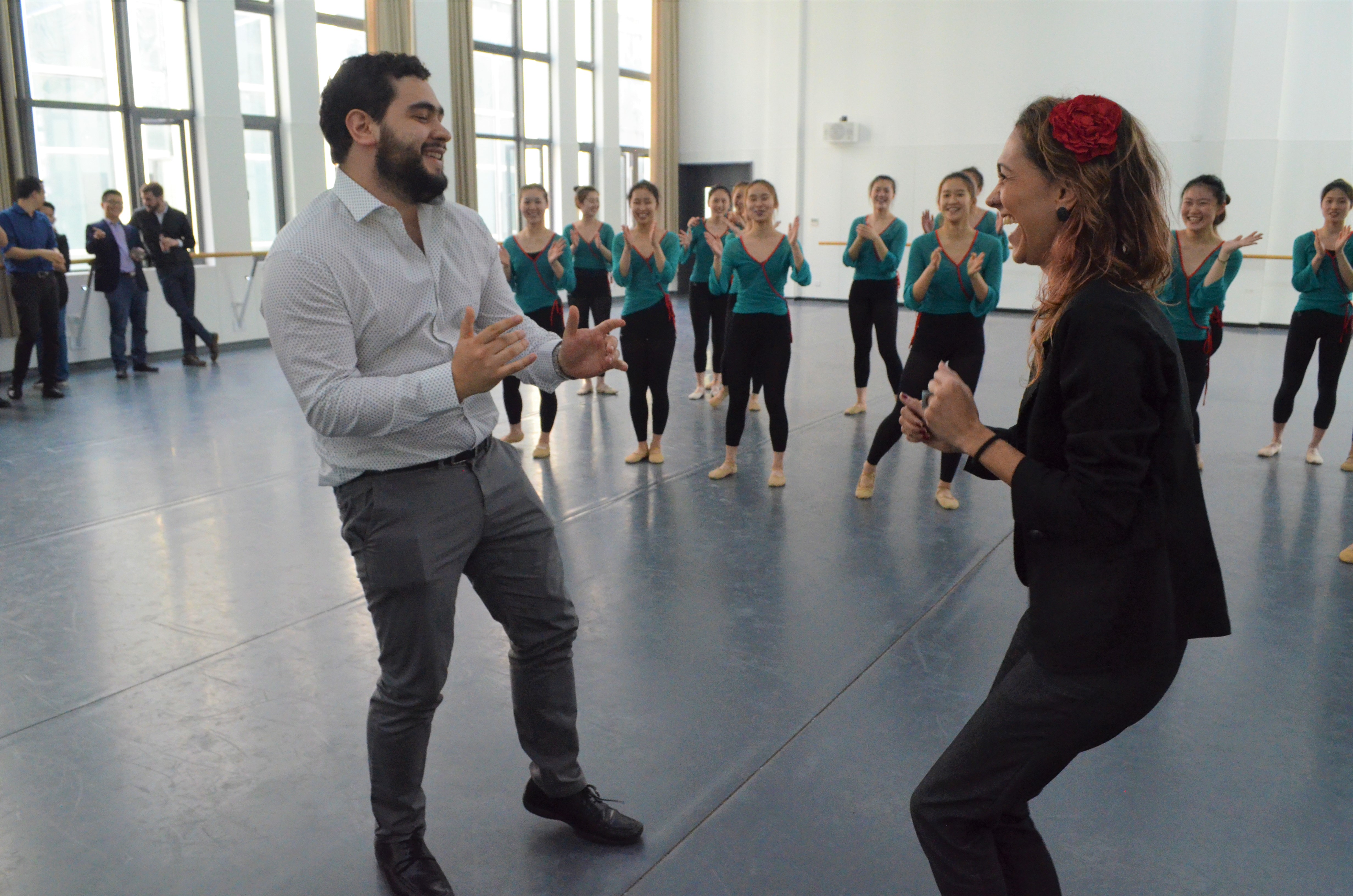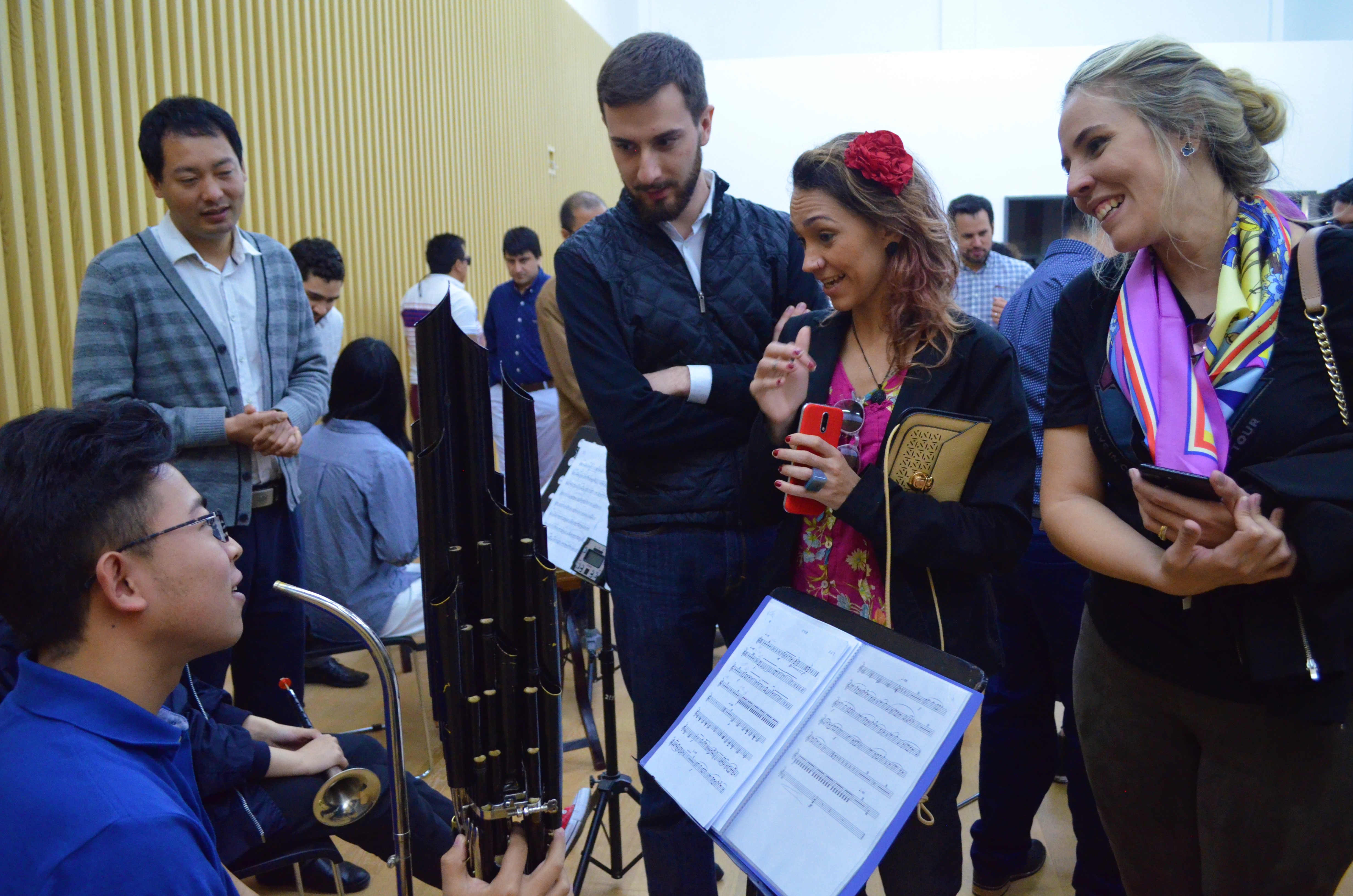 代表团成员参观了大剧院和音乐厅等场馆,通过实地考察和现场讲解,对学院的办学规模、硬件设施等方面有了较为直观地了解。青年代表团成员饶有兴致地走进音乐课堂,现场观摩学院师生的排练课,近距离感受中国艺术的魅力。在国乐系,乐队师生为青年干部代表现场演奏了《敦煌》、《西湖》两首具有浓郁民族特色的乐曲,美妙的旋律深深地吸引了在场的每一个人。演奏结束后,外国友人对中国乐器非常感兴趣,不时询问乐器的名称、类别和演奏技巧。一位来自阿根廷的青年代表对二胡表现出了浓厚的兴趣,强烈要求再来一段。同学们为他们现场演奏了二胡曲《赛马》的选段,博得了满堂彩。在管弦系,由师生带来的室内乐钢琴协奏曲表演为拉美青年干部代表展示了西洋音乐的别样艺术风格,大家沉浸在优美的旋律中流连忘返。在舞蹈系,拉美青年代表与舞蹈系师生开展了深入交流,互相教授本民族的传统舞蹈,伴随着音乐的旋律翩翩起舞,现场气氛热烈。交流活动结束后,青年干部代表对学院建设、发展和办学成绩予以了高度肯定,并表示下次有机会一定再来。
