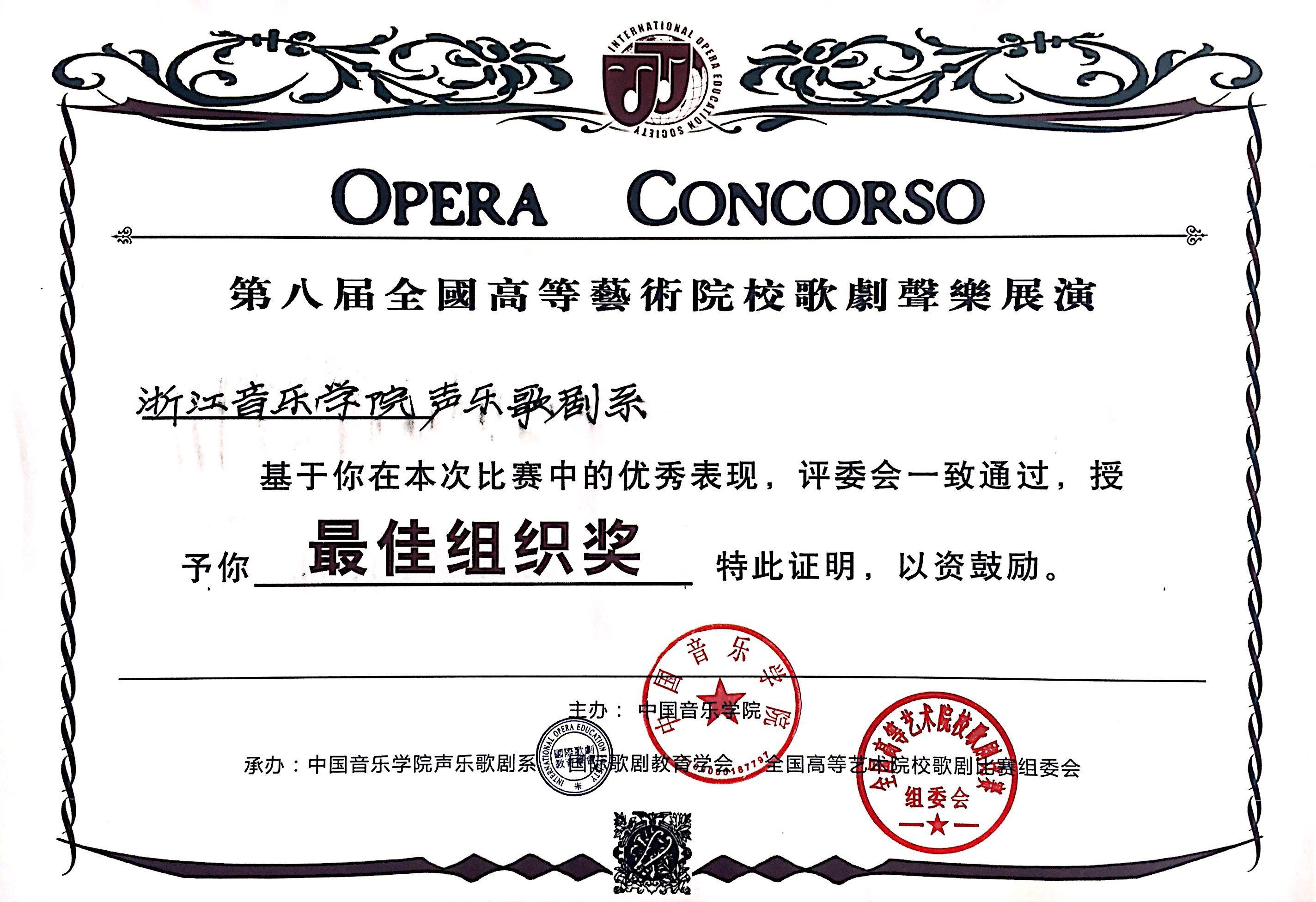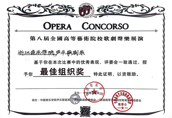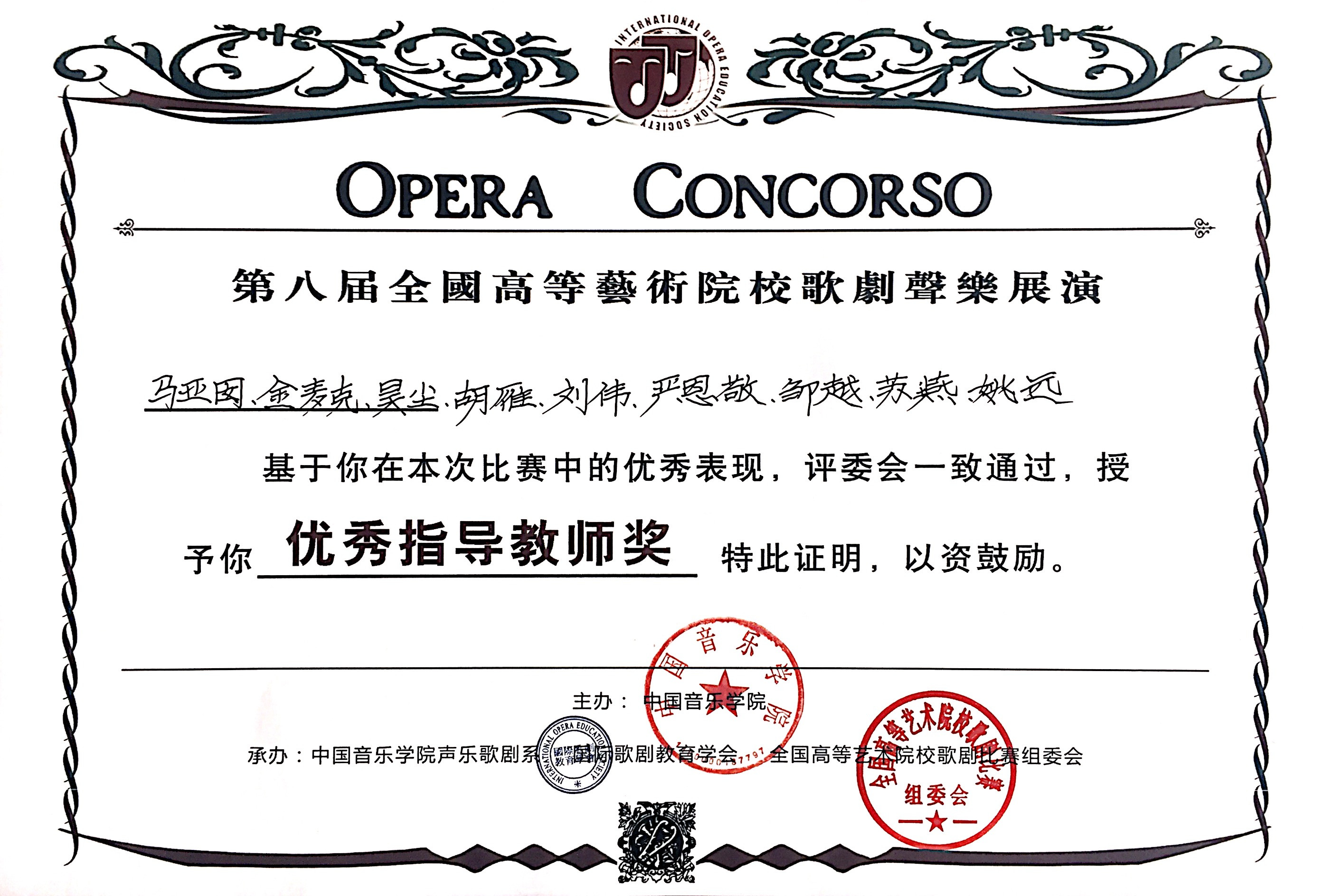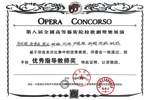 现场,声乐歌剧系获得“最佳组织奖”,同时声乐歌剧系教师马亚囡、金麦克、胡雁、刘伟、邹越、苏燕、姚远,音乐教育系教师严恩静、作曲与指挥系教师昊辰等9位教师获得“优秀指导教师奖”。