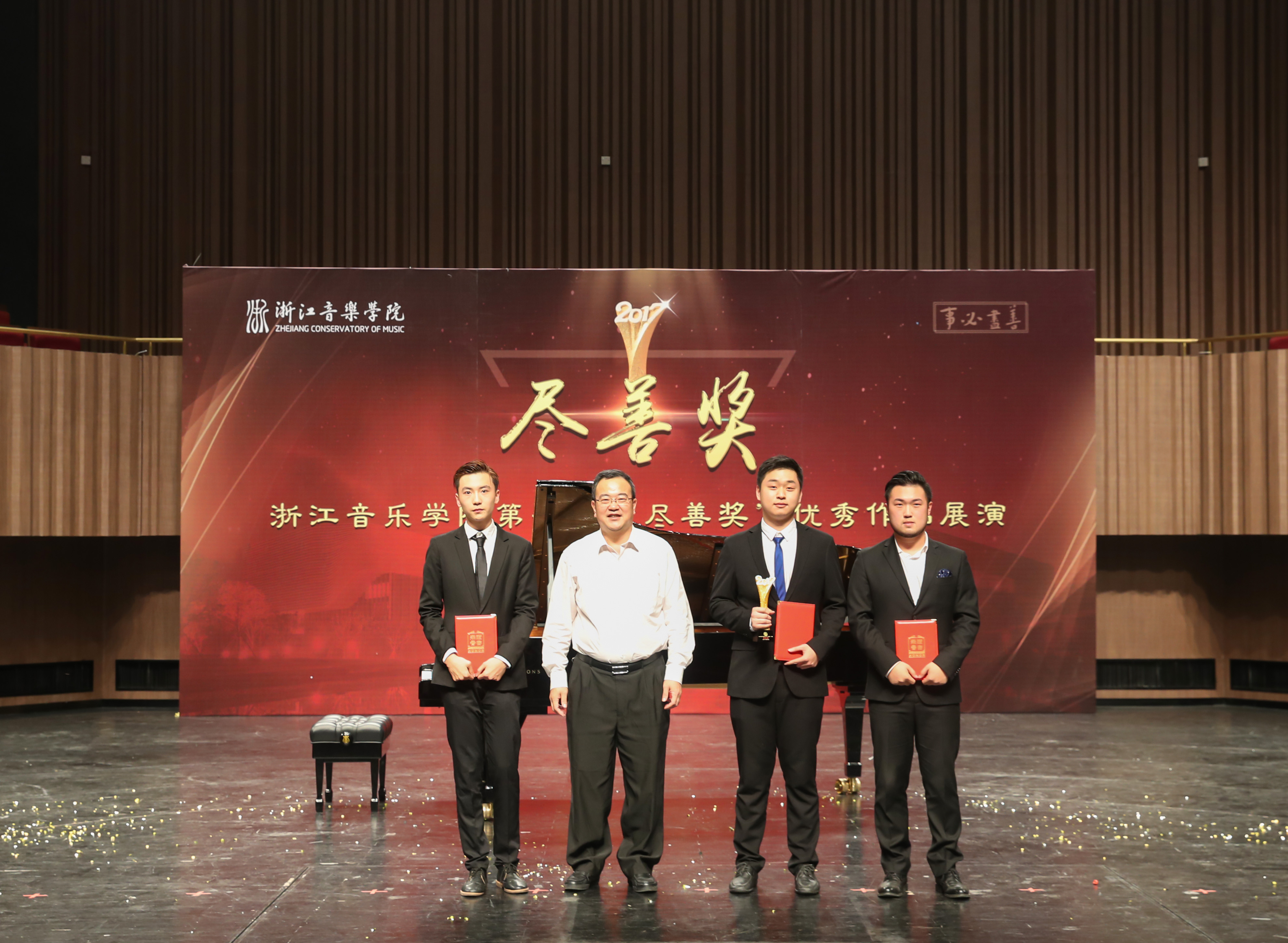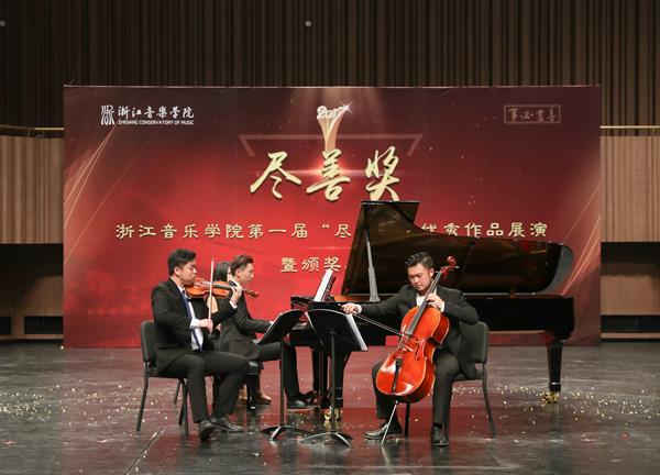 首届“尽善奖”共评选出特等奖1项、一等奖8项、二等奖10项、三等奖11项、优秀奖7项、入围奖7项。其中,由叶天男、刘德凯、浦原棋等三名同学演奏的斯美塔那《g小调钢琴三重奏》摘得本次大赛桂冠,荣获特等奖。温慧明、盛秧、金彩芳等12位老师获得优秀指导教师称号,音乐教育系、声乐歌剧系、国乐系、管弦系、流行音乐系、舞蹈系分别获得优秀组织奖。
