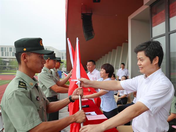 随后,学院领导向承训教官授予军训团团旗、营旗。