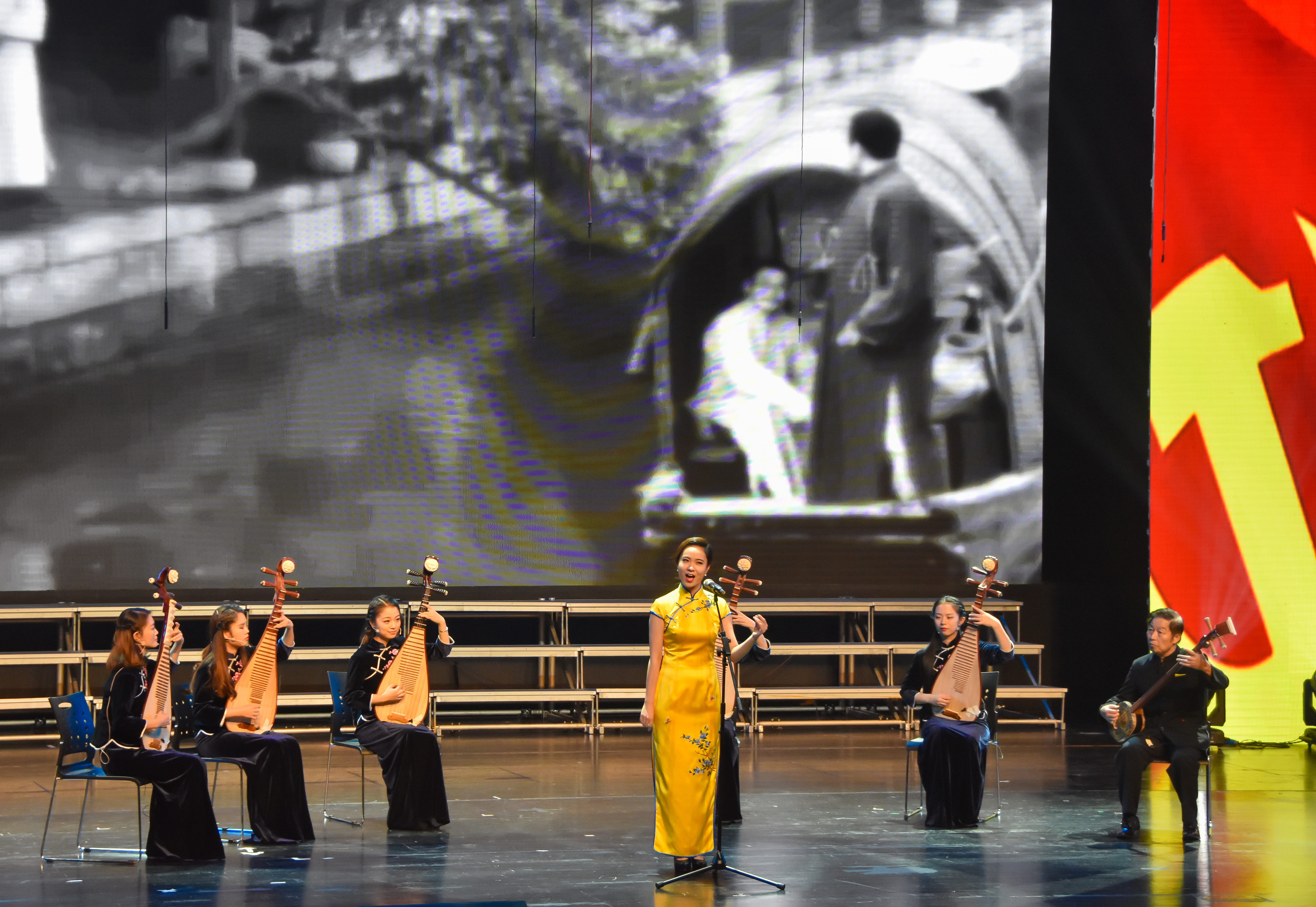第一篇章“党旗飘扬”,独唱《过雪山草地》,再现“理想信念、检验真理、唤醒民众、开创新局”的伟大远征。双钢琴演奏《保卫黄河》仿佛置身战马驰骋、硝烟弥漫的抗日战场,震撼全场。琵琶弹唱《蝶恋花:答李淑一》再现了伟人毛泽东同志的浪漫主义革命情怀。纪实片《四明红枫》中, 肖东烈士用不满29岁的生命历程诠释了“丰碑永存、精神不朽”。男高音独唱《把一切献给党》,唱出音教师生党员一心向党,不忘初心的精神风貌。小提琴合奏《翻身道情》用“道情”这一艺术形式表达对新生活的向往和热爱。