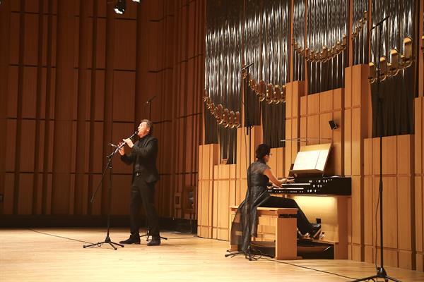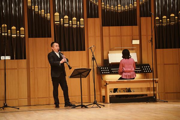 音乐会在学院管弦系单簧管教授董德君和青年管风琴演奏家李艺花合奏的作品《来自中国的色彩》颇具动感、充满浓郁中国韵味的音乐旋律中拉开首演序幕。该曲是意大利著名作曲家曼加尼2017年依据中国音乐民族调式特点创作而成的,深受当今国内外演奏家的青睐,此曲多为单簧管与钢琴合作,这是单簧管与管风琴的世界首演。作品旋律婉转流畅,格调清新雅致,通过五声调式瞬间拉近了西洋乐器与中国乐迷的距离。