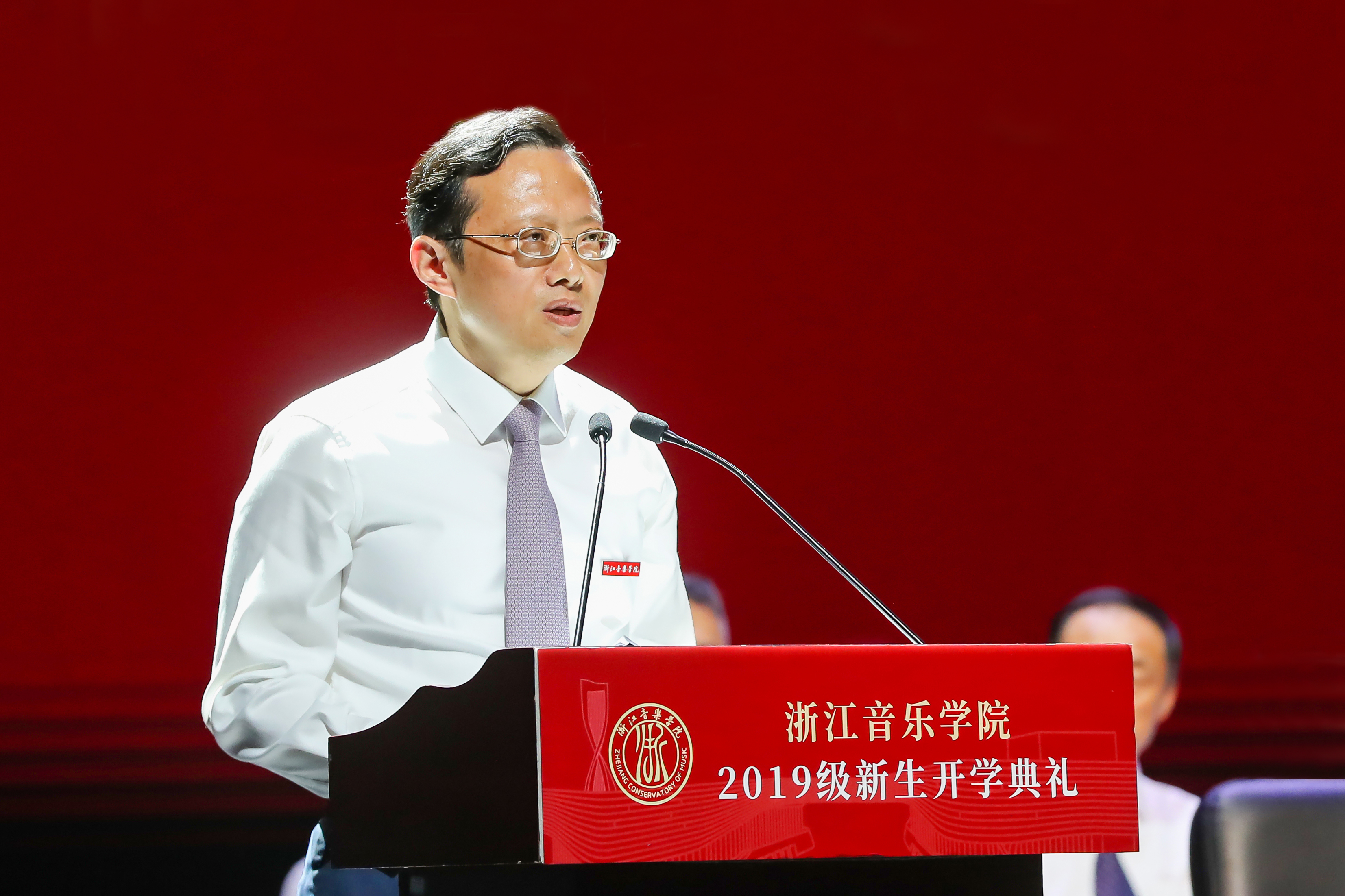 王瑞致辞,代表全校师生员工向大家表示热烈的欢迎和诚挚的祝贺,向辛勤培养学生的老师、家长表示衷心的感谢和良好的祝愿,并以“事必尽善 追求卓越”为题,从“坚守初心,为人民而歌”“崇德尚艺,成就自我”“事必尽善,践行浙音精神”三方面深情寄语。
