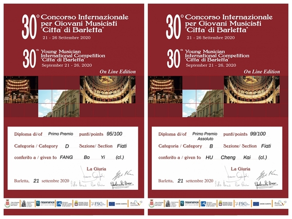 近日,在由G.CURCI文化与音乐协会举办的意大利第三十届巴列塔(Barletta) 国际青年音乐家大赛圆满落幕,我校管弦系董德君教授指导的管弦18级单簧管学生方博艺、附中初一学生胡成凯喜获佳绩,分别荣获管乐D组、B组第一名。