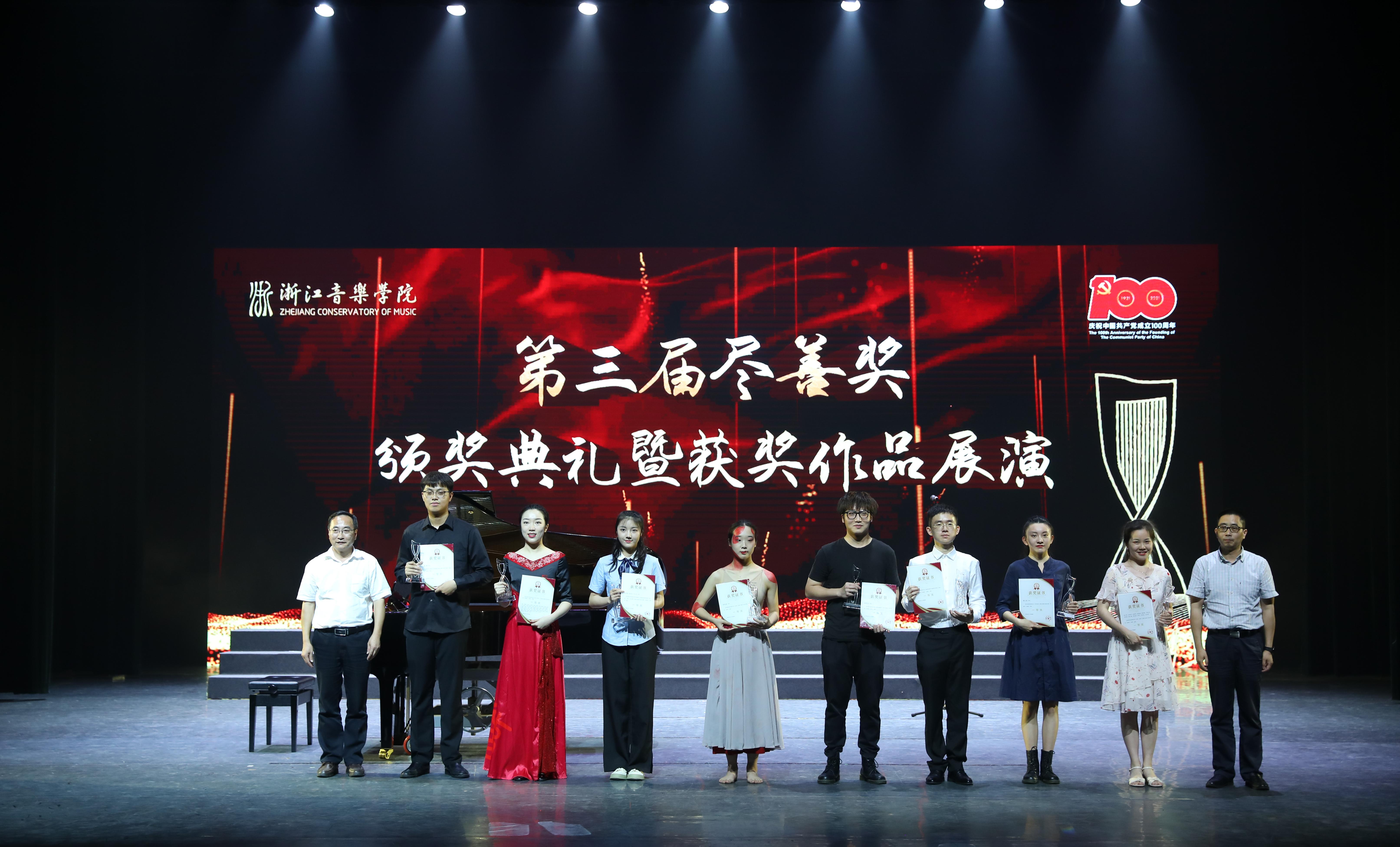 6月16日晚,学院第三届“尽善奖”颁奖典礼暨优秀作品展演在舞蹈剧场隆重举行。在本次大赛中,《祖宾斯基爵士帕蒂塔无穷动》等8个作品获一等奖;《胡旋舞》等8个作品获二等奖;《山居秋暝》等12个作品获三等奖;《The World Will Know》等17个作品获优秀奖;吴雯怡、狄佳文、刘瓅元、洪杰等11位教师获优秀指导教师奖。学院党政领导班子成员贾秀英、杨九华、张伟波、应达伟、李俊出席典礼,并为优秀指导教师和获奖学生颁奖。各学院、系(部)负责人,教师代表及参赛选手参加颁奖典礼并观摩了展演活动。