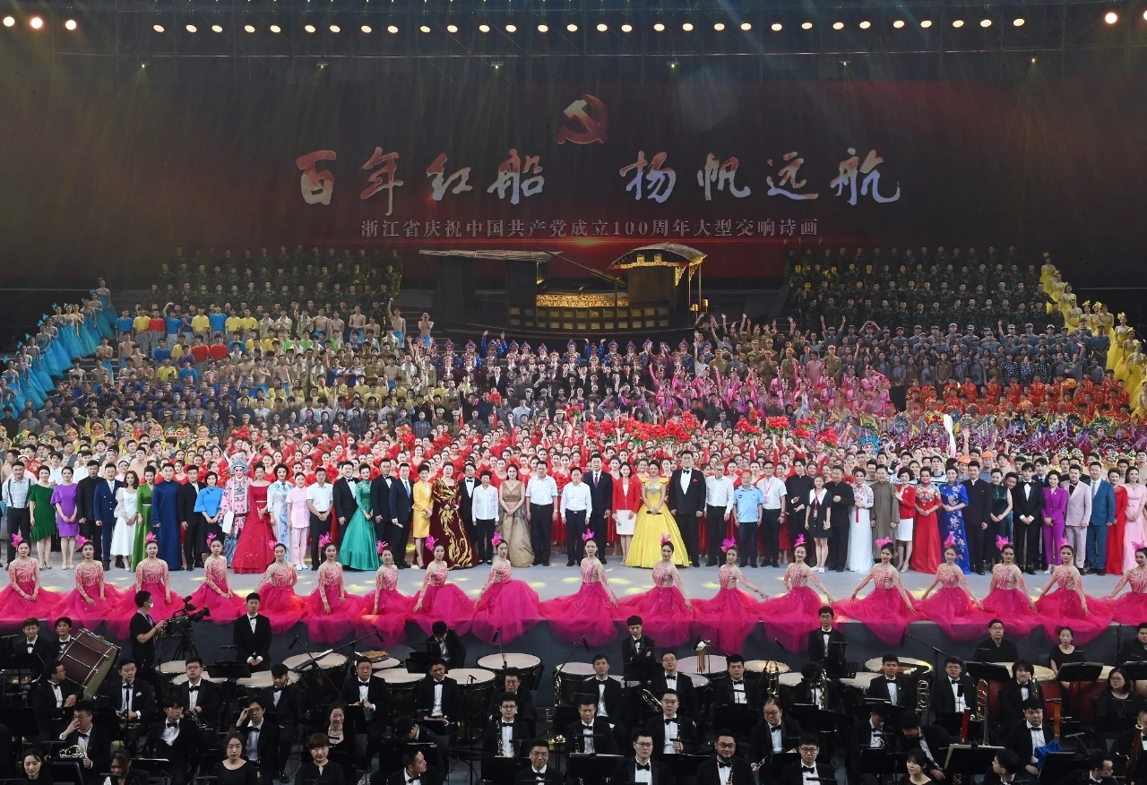 6月27日晚,浙江省庆祝中国共产党成立100周年大型交响诗画文艺演出《百年红船 扬帆远航》在黄龙体育中心体育馆上演,以艺术的形式回顾党的奋斗历程、讴歌党的光辉业绩、祝福党的百年华诞。省委书记袁家军出席并致辞,郑栅洁、葛慧君、黄建发等省党政军领导,在杭副省以上老同志,省直有关部门主要负责人及全省各界党员干部群众代表等2000余人汇聚一堂,共同观看了演出。演出由省委宣传部、省文化和旅游厅、浙江广播电视集团主办,学院和浙江演艺集团、浙江省黄龙体育中心承办。