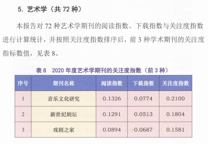 近日,《国家哲学社会科学文献中心学术期刊数据库用户关注度报告(2020年度)》正式发布。学院学术期刊《音乐文化研究》位列全国艺术学期刊关注度排名第一位,并获评艺术学最受欢迎期刊。这是期刊连续两年蝉联关注度排名第一及最受欢迎期刊的好成绩。