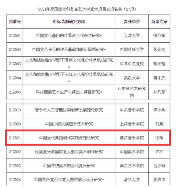 国家社科基金艺术学重大项目在艺术学科繁荣发展中具有重要地位和标志性意义,是艺术学科中层次最高、资助力度最大、权威性最强的研究项目,具有重大的导向性、权威性和示范性。本次公布的2021年国家社科基金艺术学重大项目立项名单共有27项重大项目获批立项,其中舞蹈类研究项目仅此1项。