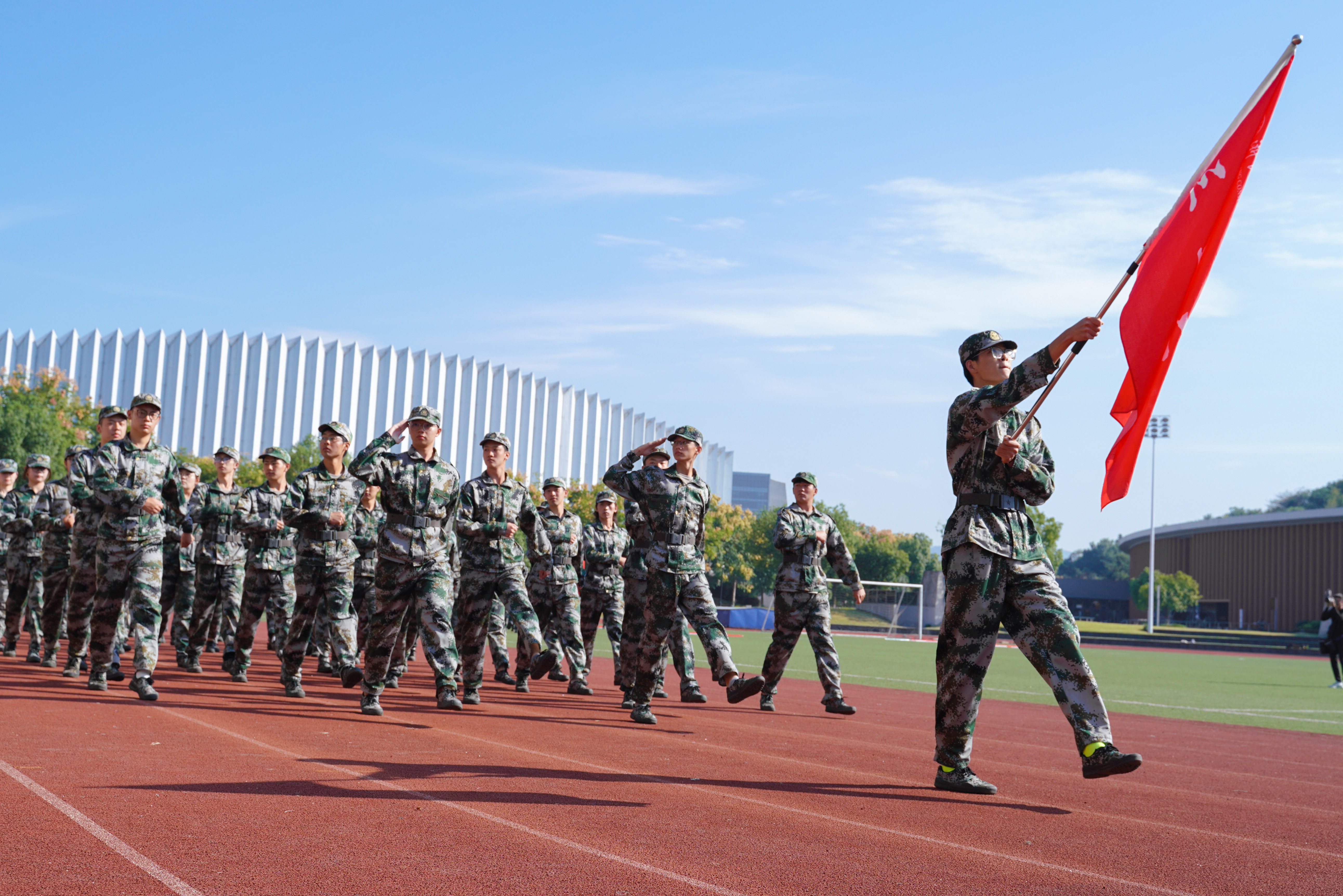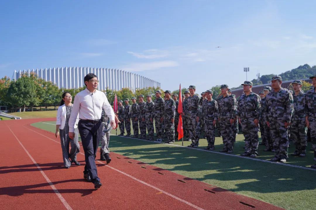党委书记胡建新在樊彦利的陪同下对2021级700余名新生军训营列队方阵进行了检阅。同学们英姿飒爽,斗志昂扬,展现了浙音新生良好的精神风貌。