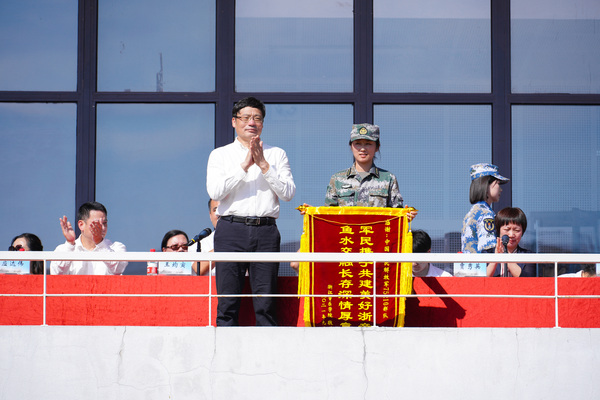 胡建新向承训部队赠送锦旗“军民携手共建美好浙音,鱼水交融长存深情厚意”,表达对承训部队军官的感谢。