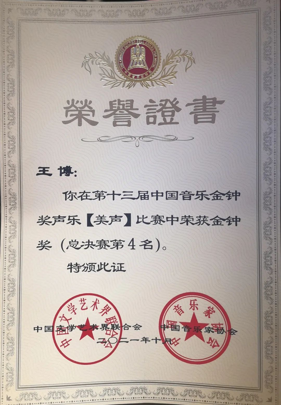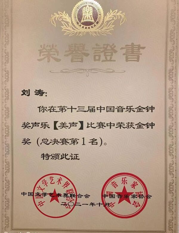 10月24日,在刚刚结束的第十三届中国音乐金钟奖美声组总决赛中,学院青年教师刘涛以98.29分荣获第一名,声乐歌剧系本科四年级学生王博(指导教师陶维龙、艺术指导金麦克)以97.58分荣获并列第四名,双双夺得金钟奖,在5名金钟奖获奖者中占据2个席位。