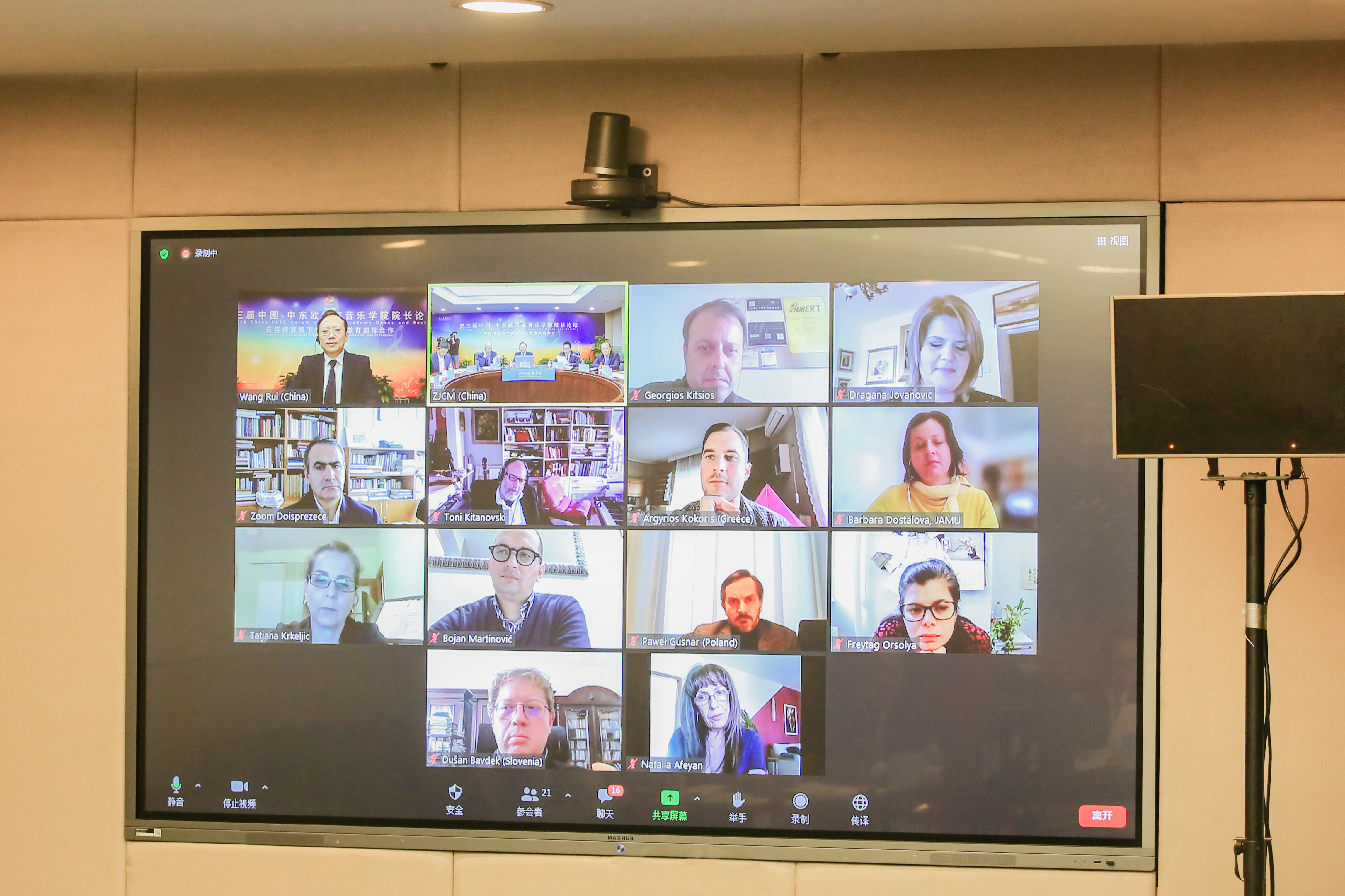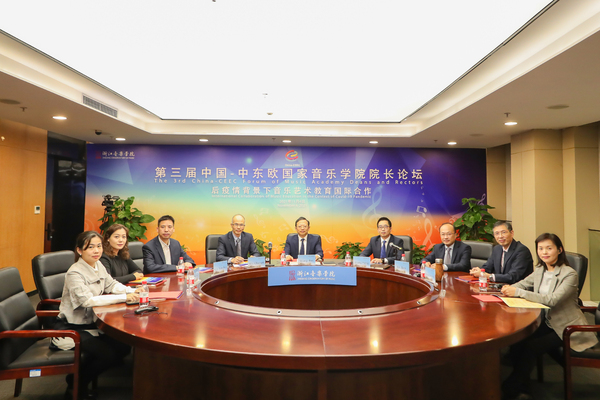 “开放创造机遇,包容成就多元”。为贯彻落实习近平主席在中国—中东欧国家领导人峰会主旨讲话的重要精神,探索疫情防控常态化背景下中国—中东欧国家音乐院校联盟建设,服务国家“一带一路”倡议在文化教育领域的发展,在文化和旅游部国际交流与合作局、浙江省文化和旅游厅指导下,11月4日,浙江音乐学院主办的“第三届中国—中东欧国家音乐学院院长论坛”以线上会议的形式成功举行。浙江音乐学院院长王瑞与来自保加利亚、捷克、匈牙利、北马其顿、黑山、波兰、罗马尼亚、塞尔维亚、斯洛文尼亚、希腊10个中东欧国家的16位校(院)长和专家学者同步连线,共同围绕“后疫情背景下音乐艺术教育国际合作”主题展开探讨。会议由学院副院长汪洋主持,办公室、宣传部、发展规划处(科研处)、教务处、研究生处、艺术处、国际交流合作处、信息技术中心相关负责人参加。