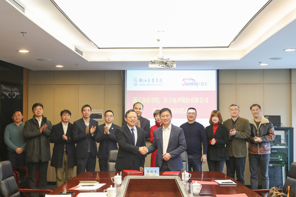 为贯彻落实省委文化工作会议精神,助力新时代文化浙江工程建设,深入推进校企协同创新和协同育人,1月8日上午,学院与音王电声股份有限公司在行政楼1003会议室签署战略合作框架协议。学院党委书记胡建新接见了音王一行,院长王瑞、党委副书记王均寅、副院长汪洋,音王电声股份有限公司董事长王祥贵、执行总裁陈众、副总裁曹山,以及学院相关职能部门、音王相关部门负责人出席签约仪式。