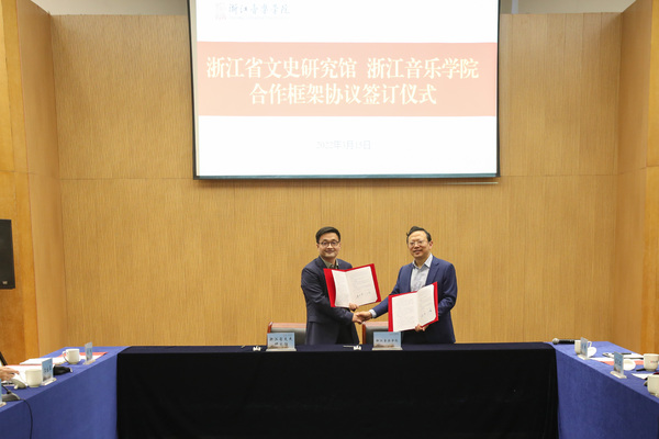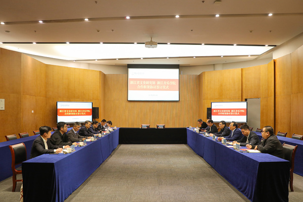 为贯彻落实中央文化发展战略和省委文化工作会议精神,深化馆校合作和双方研创成果共享,合力助推浙江新时代文化高地建设,3月15日下午,浙江省文史研究馆与学院在行政楼103会议室签署战略合作框架协议。浙江省人大常委会原副主任、浙江省文史研究馆馆长王永昌,浙江省文史研究馆专职副馆长姜玉峰、副馆长成明权,学院党委书记胡建新、院长王瑞及浙江文史研究馆和学院相关职能部门负责人出席签约仪式。