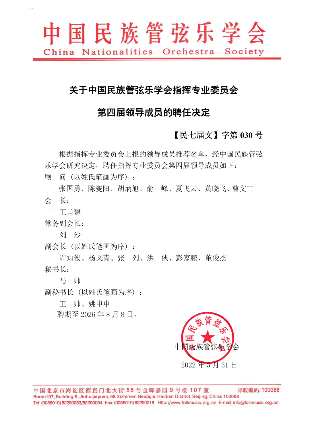 3月31日,中国民族管弦乐学会指挥专业委员会换届大会在京召开。学院民族乐队学院艺术总监、院长,国乐系主任王甫建教授连任中国民族管弦乐学会指挥专业委员会会长。