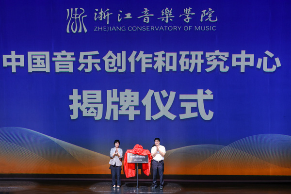 音乐会前,浙江音乐学院中国音乐创作和研究中心揭牌仪式举行。党委书记干武东与朱海闵为中心揭牌。