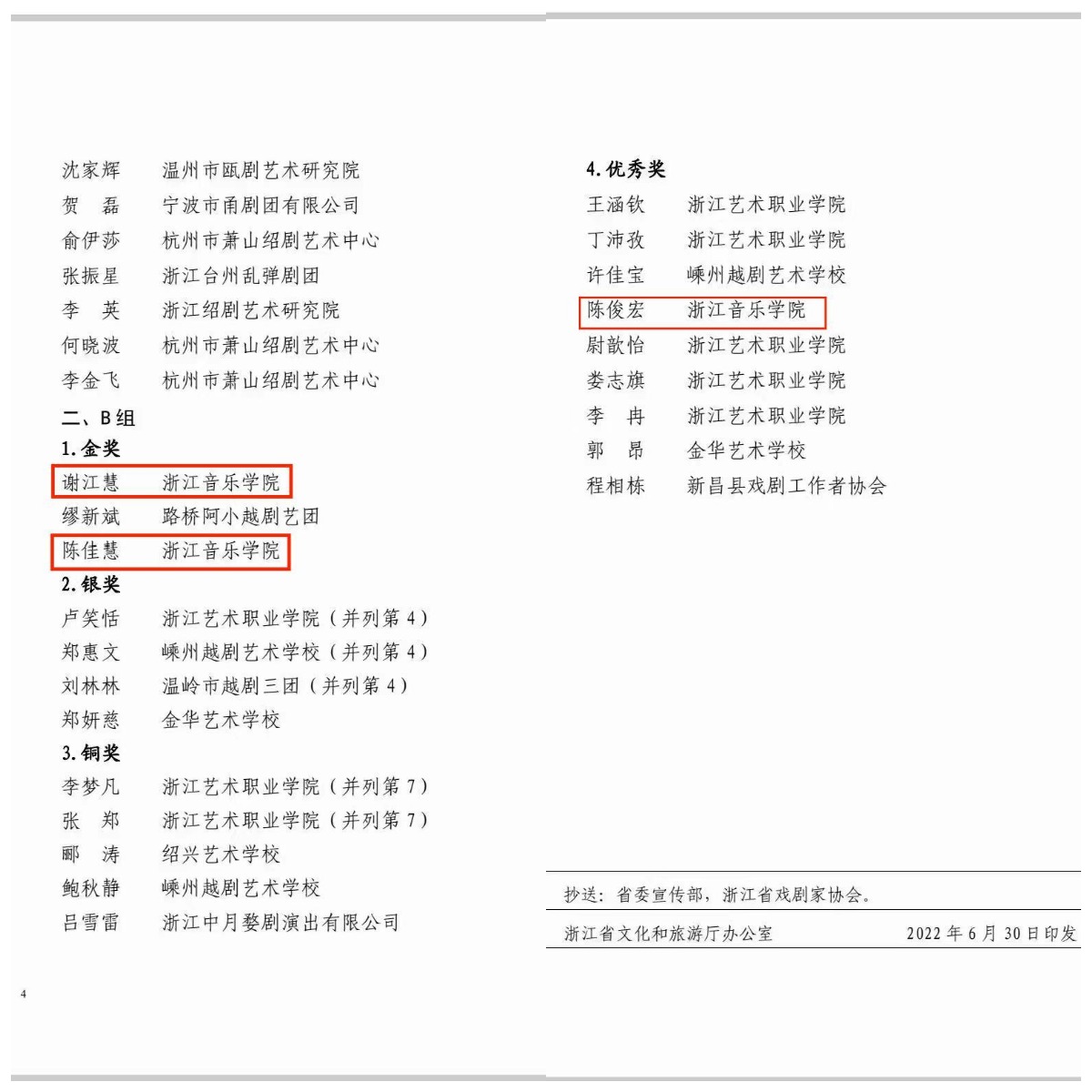 由戏剧系教师金彩芳指导,越剧演员19级学生谢江慧表演的越剧《窦娥冤·斩娥》获得B组文戏第一,越剧演员21级学生陈佳慧表演的《焚香记·打神告庙》获得B组文戏第三,双双获得金奖,在B组三项金奖中占据两席。由教师项卫东指导,越剧演员20级学生陈俊宏表演的京剧《汉宫惊魂》获优秀奖。