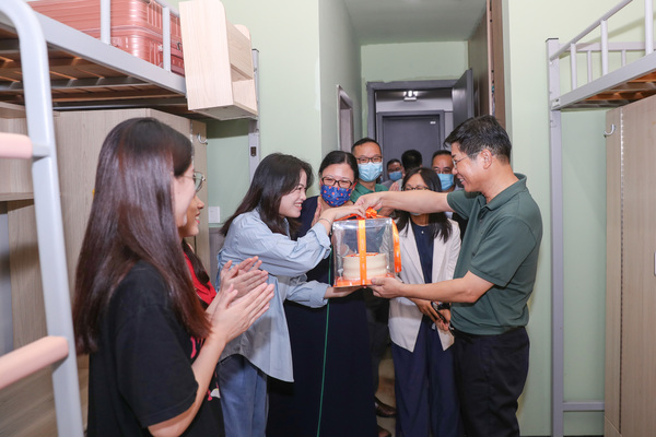 报到当天上午,学院党政领导班子成员干武东、蔡亦军、张伟波、李俊及相关部门负责人来到迎新报到现场,与新生亲切交流,向他们表示热烈欢迎,并慰问了现场工作人员与志愿者。随后,学院领导一行来到公寓看望新生。党委书记干武东、党委副书记蔡亦军为当天过生日的同学送上蛋糕和鲜花,副院长张伟波向新生赠送书籍。