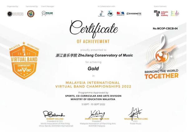 近日,在“2022马来西亚国际线上管乐大赛”中,由指挥家林友声教授执棒的浙江音乐学院交响管乐团荣获室内管乐组金奖,林友声荣获最佳指导教师奖。