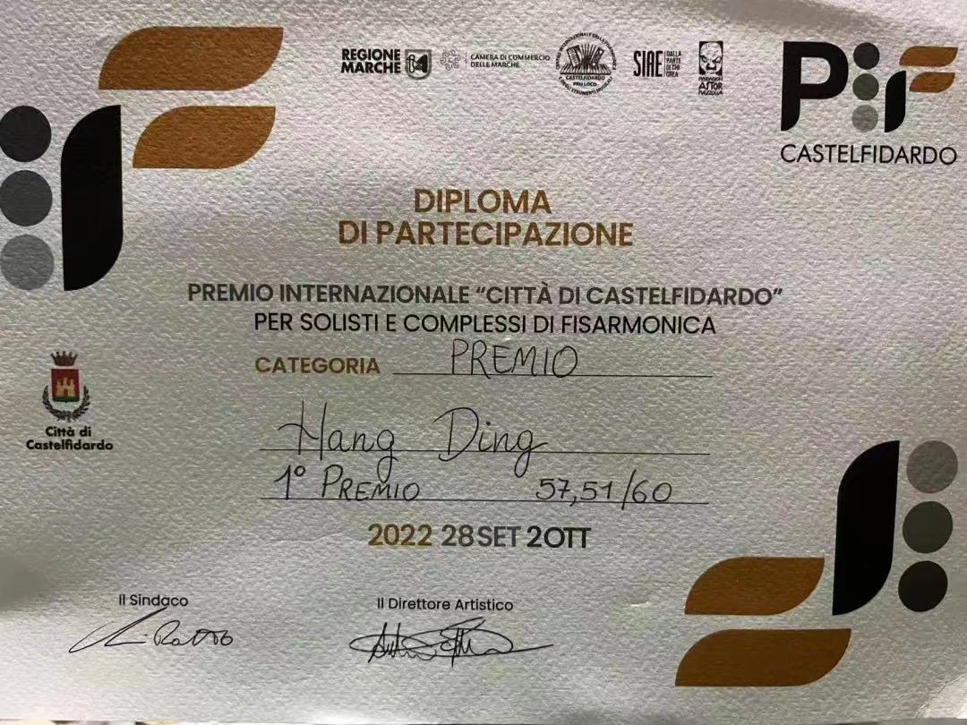 近日,在刚刚落下帷幕的第47届意大利卡斯特费达多国际手风琴大赛中(简称PIF),学院流行音乐系本科三年级学生丁航(指导教师:吴雯怡)力压群雄,荣获该赛事最高组别“艺术家组”第一名,并授予NUGO特别奖。