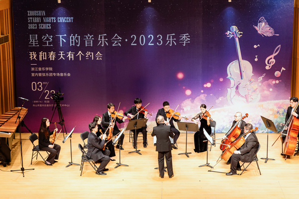 在校地战略合作框架下,学院于3月23日晚,在舟山市文化艺术中心举办“星空下的音乐会·2023乐季”浙江音乐学院室内管弦乐团专场音乐会。学院副院长董德君和舟山市相关领导,舟山市宣传文旅系统和全省海岛公园联盟等单位代表,以及300余名市民在现场观看了演出。