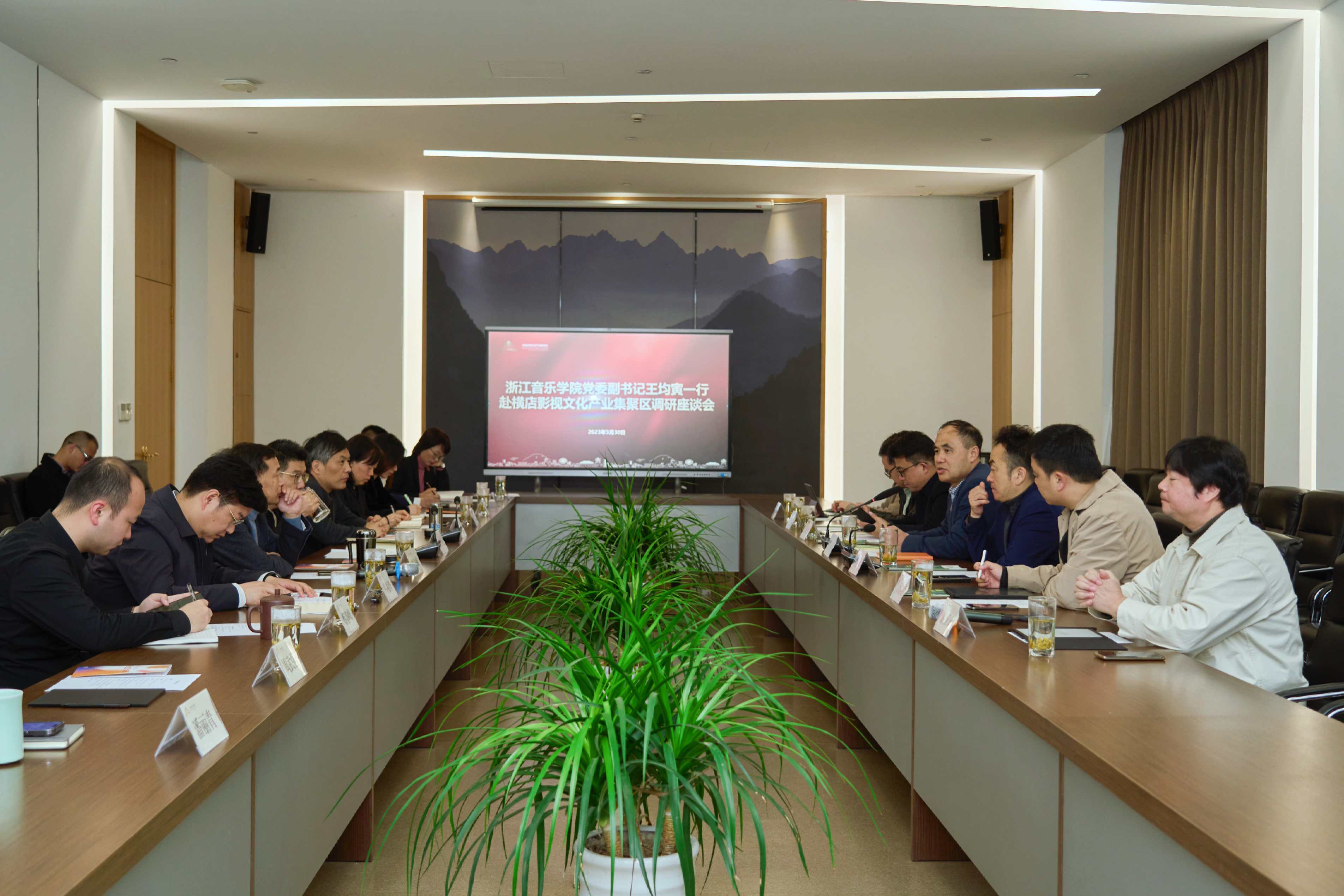 王均寅表示,横店影视文化产业集聚区是浙江影视文化产业发展的重镇和文化改革创新的排头兵,与浙音在产学研领域有着广阔的合作空间。他提出,双方可拓展三个方面合作:一是加强人才合作,依托浙音学科专业和科研创新优势,紧密结合集聚区的产业资源与科技创新力量,加强在影视音乐创作制作等领域人才培养与资源共享,做实做强实践基地平台,为学生实习实践、就业创业提供更广阔空间;二是加强产学研合作,发挥集聚区作为全国最大影视产业集聚的优势,加强数字音乐产业学院和重点实验室等科研平台与集聚区的产学研对接,推动教学、研究与产业的创新转化;三是加强品牌合作,双方在艺术品牌节会、公共文化服务、全国性赛事和学术活动等领域拓展合作,共同推动影视音乐节、计算机设计大赛、“文艺轻骑兵”等项目建设。