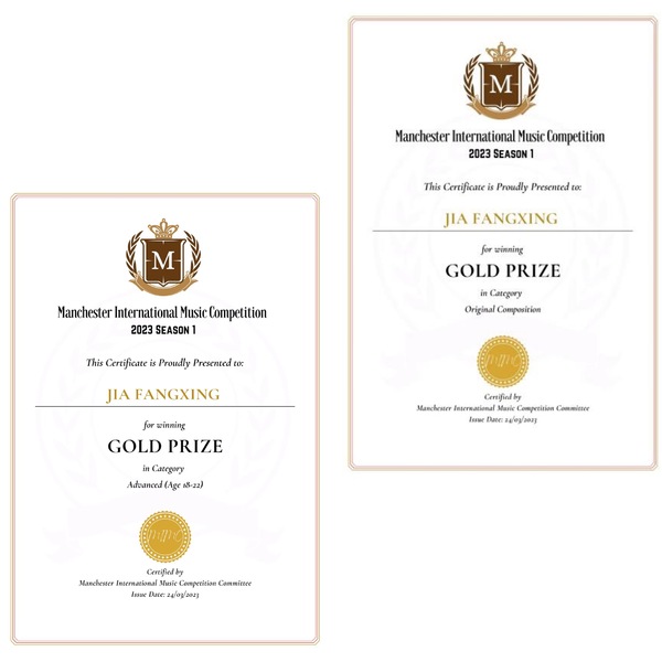 近日,来自音乐工程系音乐设计与制作专业2021级本科生贾方兴的作品Titmice Suit No.3 Survival Game《山雀组曲Ⅲ 鹰口逃生》(指导老师:姜超迁)一举获得英国曼彻斯特国际音乐比赛(Manchester International Music Competition)作曲组、高级组(18-22岁)两项金奖。