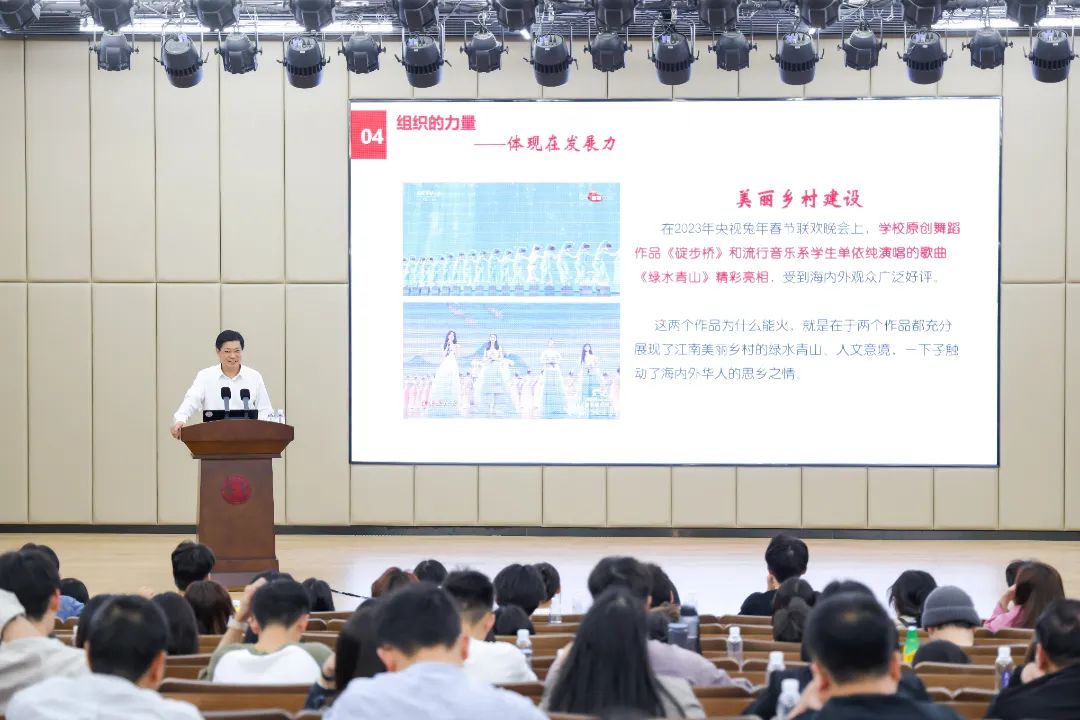 各二级党组织书记、机关职能部门部分党员干部、全体辅导员、人文社会科学部(马克思主义学院)全体党员教师以及声乐歌剧系联系班级学生、教师党支部和学生党支部委员、各院系学生党员代表等聆听了党课。