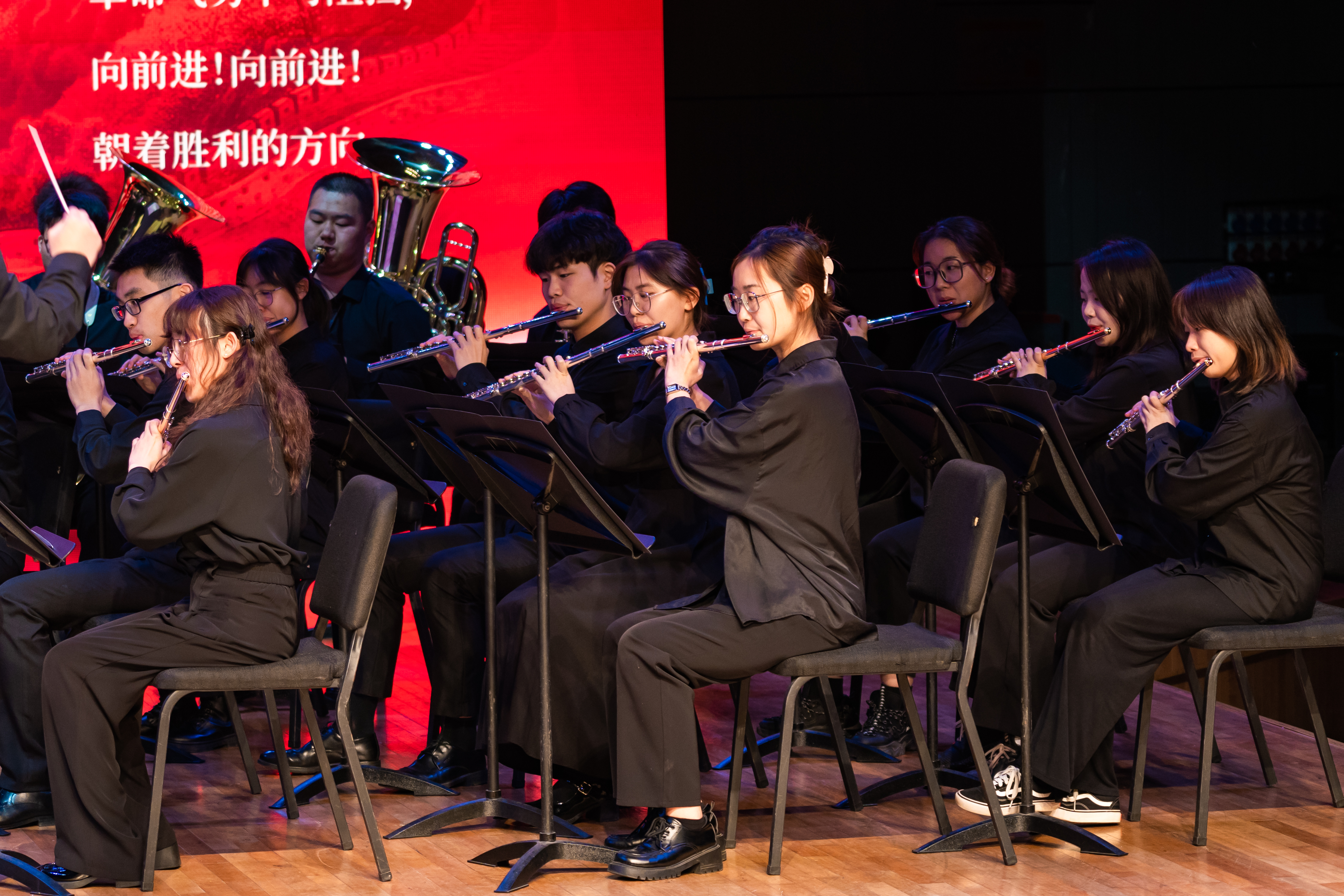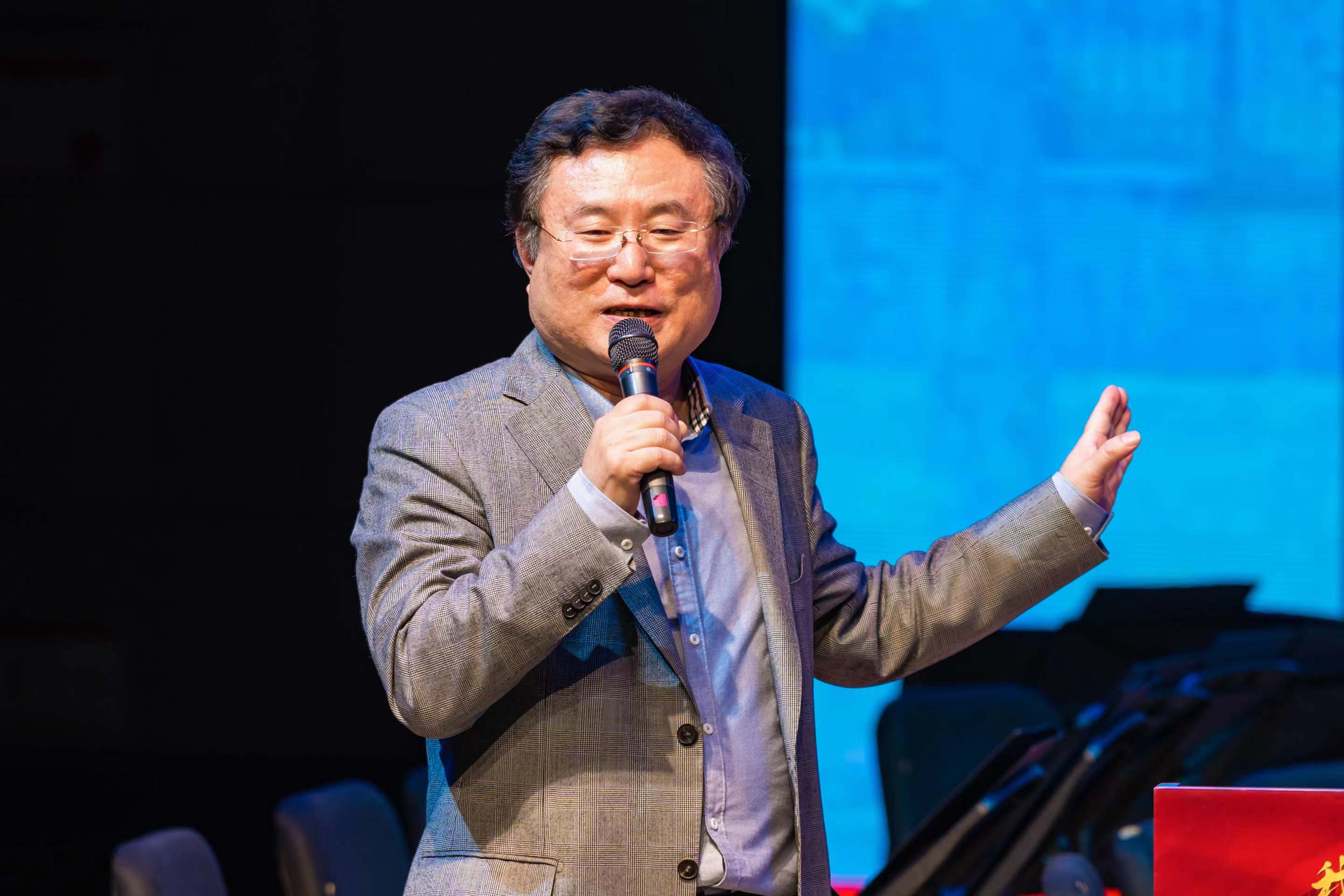 现场,魏煌教授以“我们走在大路上——‘红色音乐家’李劫夫的音乐创作”为题,围绕红色经典歌曲《我们走在大路上》,分享了李劫夫音乐创作背后鲜为人知的故事。他从李劫夫的生平、音乐创作及其教育思想、毛主席诗词歌曲三个部分展开叙述,深刻剖析了李劫夫音乐作品如何历久弥新的魅力所在。音乐语言化,语言音乐化,李劫夫的作品具有浓郁的民族风格,鲜明的地方特色、兼容并蓄,融贯中西、词曲交融,浑然一体、简洁质朴,情景交融的特点,如此贴近人民生活的创作作品,才能流传至今、广为传唱。“未来的艺术工作者如何继承和发扬老一辈音乐家的精神,用笔下的音符讴歌党、讴歌人民、讴歌时代,这需要我们认真思考。”魏煌教授短短的几句话,朴实无华、感人至深,却引起了师生强烈的共鸣。讲座尾声,学院管乐团还演奏了《我们走在大路上》,在场的师生不由自主地跟着旋律歌唱起来。