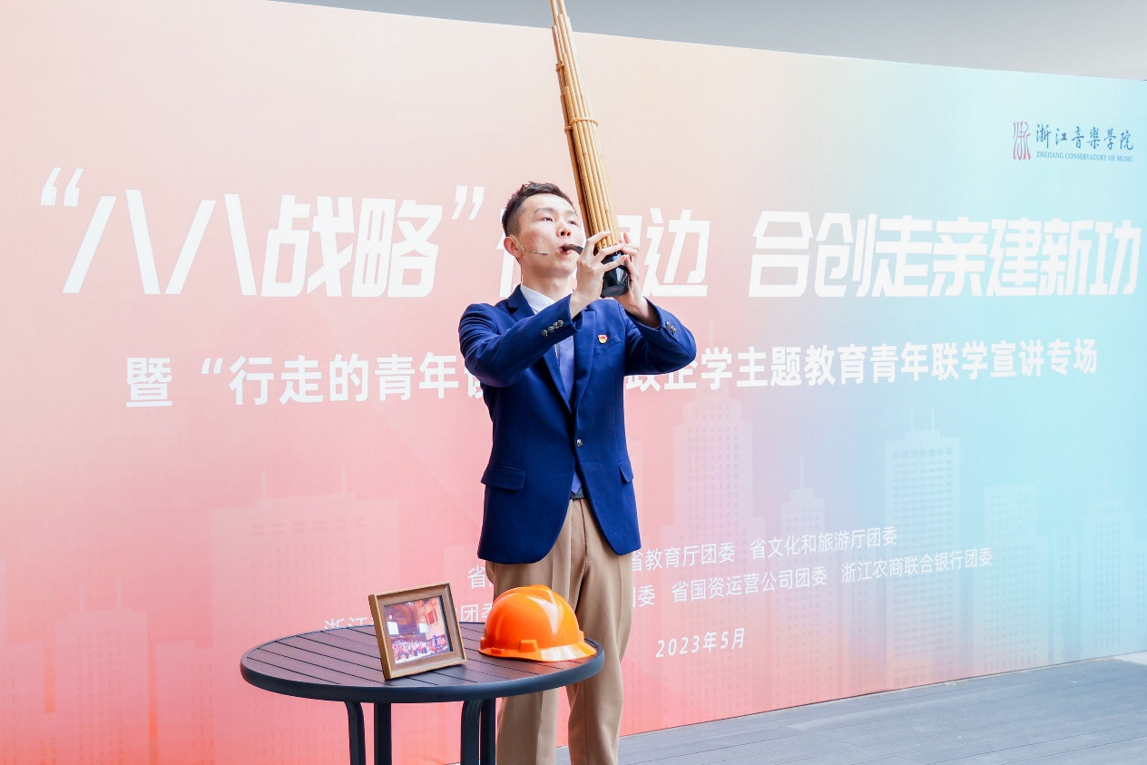 伴随着袅袅的吹竽声,在学院青年艺术家宣讲团成员、省思政微课特等奖获得者王刘的宣讲中,展示了校园建设中的一顶安全帽,全球巡演中的一张照片和《宋韵华章》中的一把古声竽,他分享了自己眼中的文化浙江发展历程。省教育厅8090宣讲团成员毛寒冰带来的“八八战略在身边”主题宣讲,用一项项教育工程展现“八八战略”下浙江教育快速发展的二十年图景。“我们对家庭困难的学生实行全免费午餐。”“对农村中小学教师实施素质提升工程,3年内完成17万名农村中小学教师培训。”……毛寒冰话音刚落,会场上响起了一片赞同声。“浙企青音”浙江国企青年理论宣讲团成员、省国有资本运营有限公司所属发展资产公司胡竞将“八八战略”指引下的国企故事连成线,搬上宣讲台,深情讲述了浙江国企在奋进“两个先行”的赛道上唯实惟先,善做善成的生动实践。