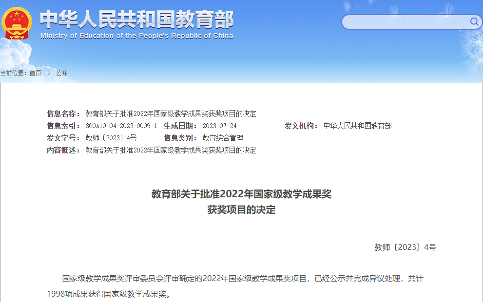 国家级教学成果奖每4年评审一次,与国家自然科学奖、技术发明奖、科学技术进步奖共同组成我国的四大国家级奖项,体现了党和国家对高校教育教学工作的高度重视。国家级教学成果奖代表着全国教育教学工作当前的最高水平,是衡量中国大学教学水平、教学能力和教学质量的重要标志,也是教育部学科评估和“双一流”评选的重要指标之一。