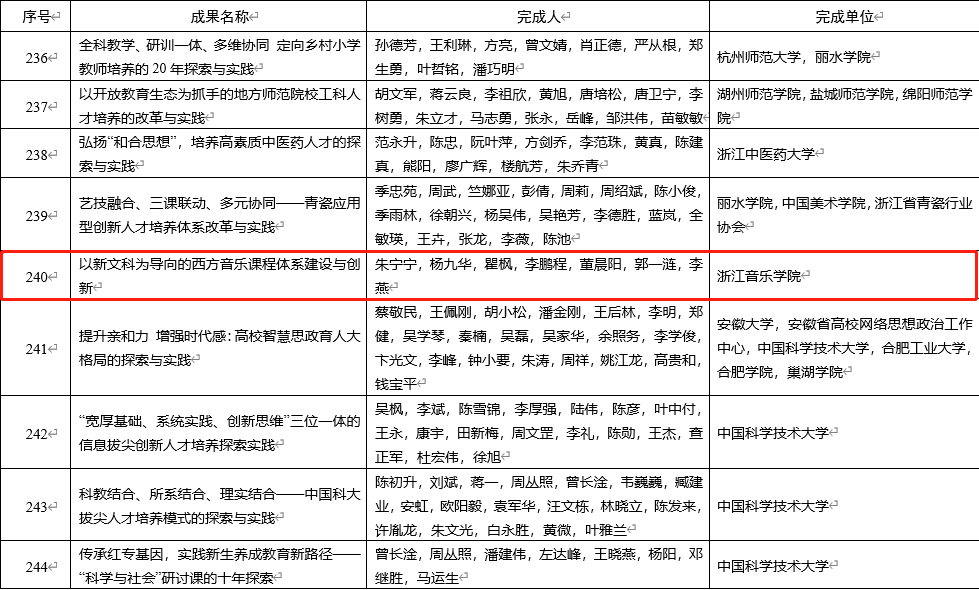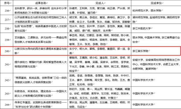 7月24日,教育部发布了关于批准2022年国家级教学成果奖获奖项目的决定。由音乐学系朱宁宁教授领衔完成的“以新文科为导向的西方音乐课程体系建设与创新”教学成果项目荣获高等教育(本科)国家级教学成果奖二等奖,实现了学校在国家级教学成果奖方面零的突破,也是学院在国家级重大奖项方面的历史性突破。