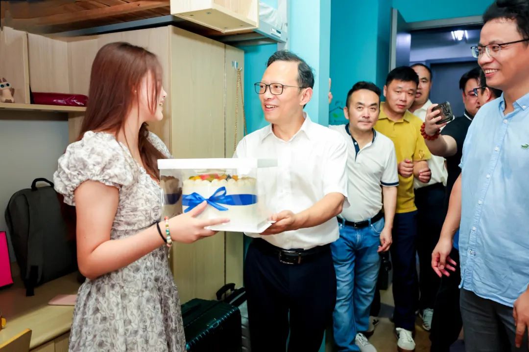 当天,学院领导王瑞、王均寅、蔡亦军、汪洋、奚丽萍、董德君一行来到报到点、公寓看望新生,与同学、家长们亲切交谈,并为过生日的同学送上蛋糕和贺卡。