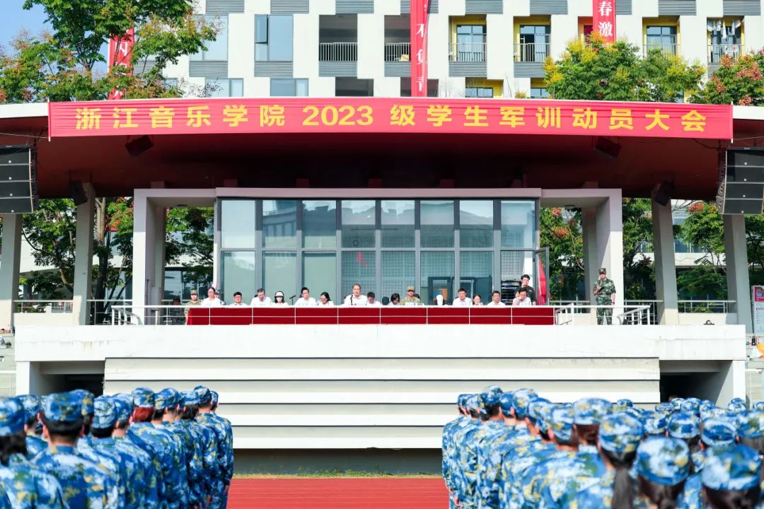 9月18日上午,学院2023级本科新生军训动员大会在学院田径运动场举行。学院党委副书记王均寅、副院长汪洋,中国人民解放军驻杭部队少校潘宇安教导员,中国人民解放军驻杭部队上尉、浙江音乐学院学生军训营营长刘敏,相关部门负责人、各院系二级党组织负责人、全体辅导员、新生班主任代表、承训部队教官,以及全体本科新生出席动员大会。大会由学生工作部、人武部部长主持。
