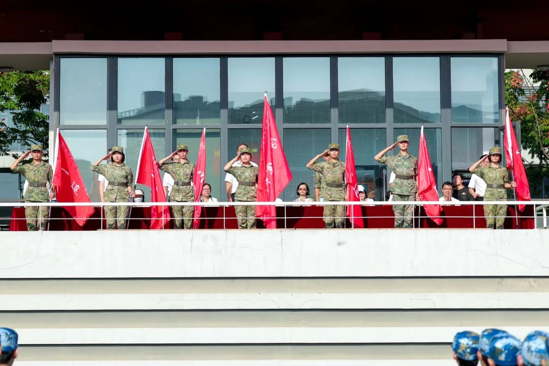 大会上,主席台领导向承训教官授军训营营旗。学生代表、音乐工程系赵恒未向全体新生发出倡议。