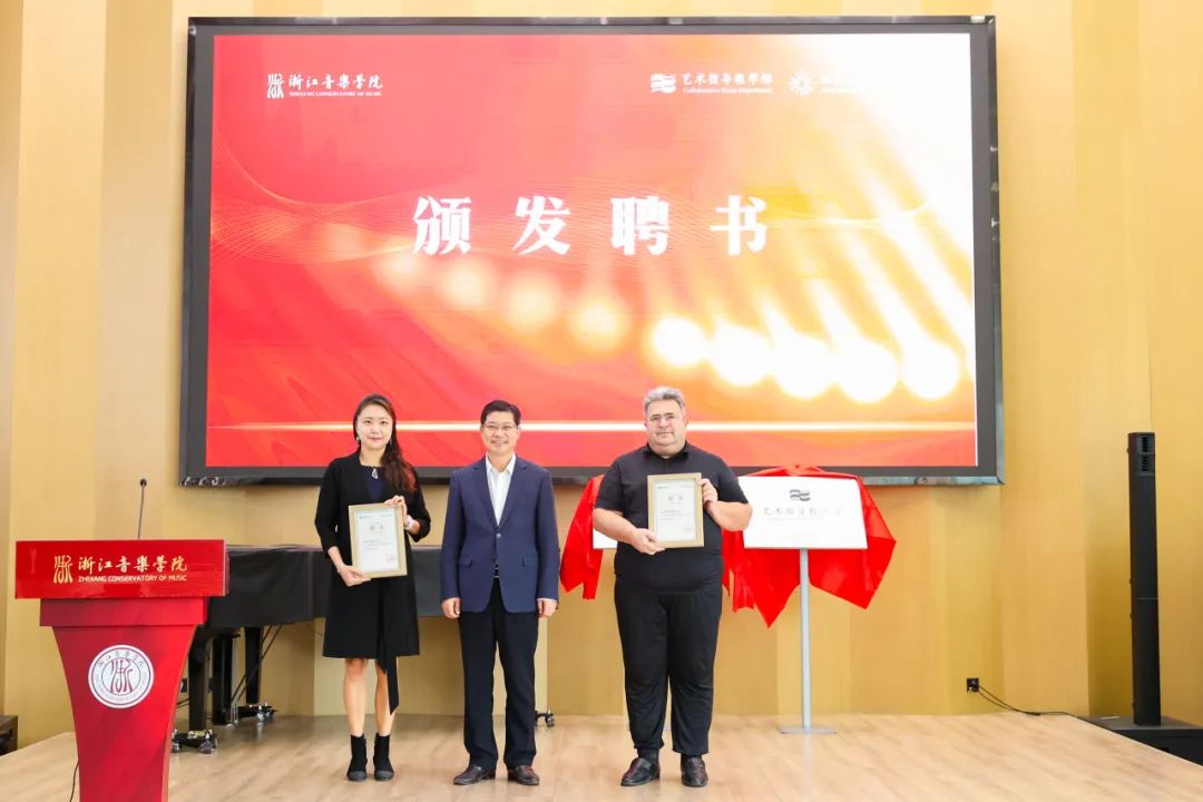 干武东为艺术指导教学部(钢琴合作艺术中心)首席艺术指导罗曼·克鲁莫夫、史佳怡颁发聘书。