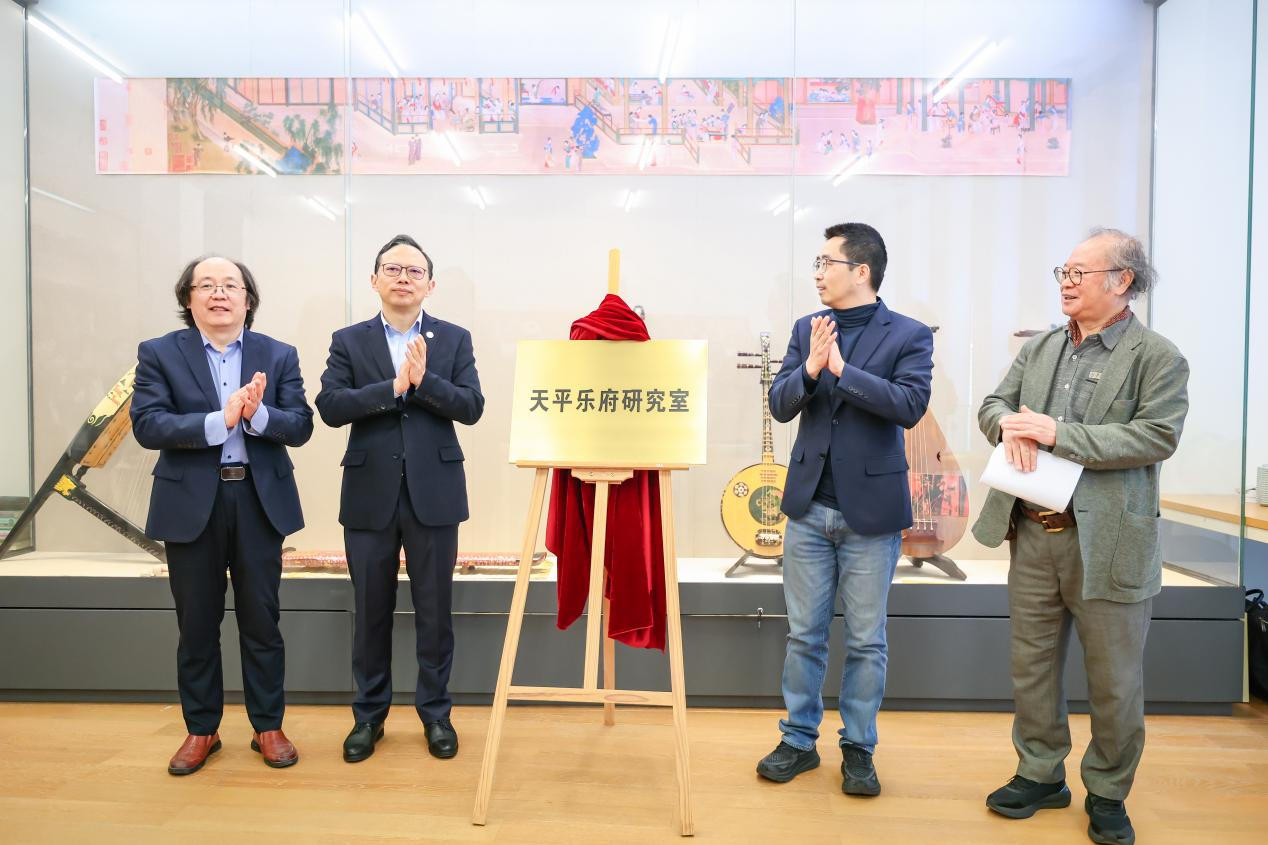 论坛开幕式之后还举办了“天平乐府研究室”揭牌仪式,王瑞、汪洋、图书馆负责人与学院特聘研究员刘宏军共同为研究室揭牌。该研究室展出了刘宏军多年来复制、收藏的我国唐传日本的乐器、乐谱、歌舞图卷、面具等藏品,具有较高的资料价值。