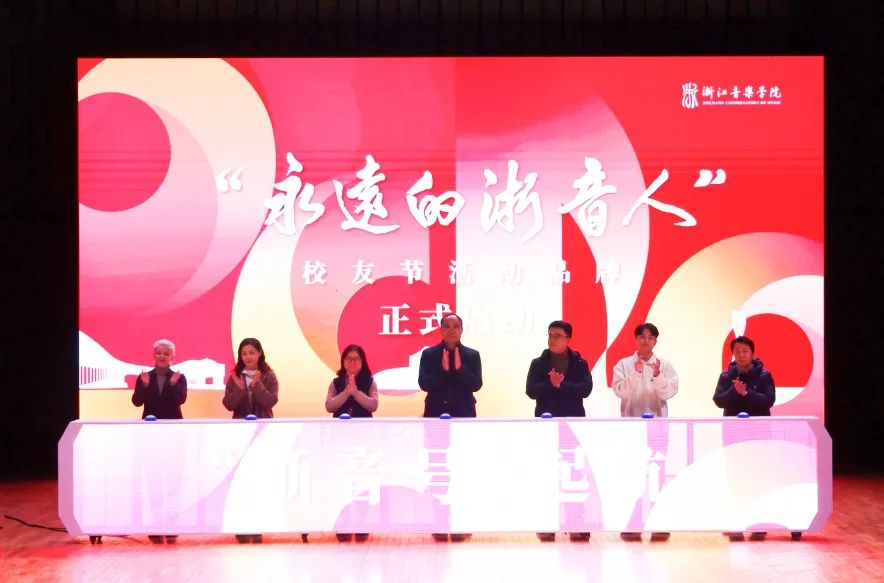 仪式上,王均寅与办公室、学生工作部、研究生工作部、社会合作中心(校友办)负责人,以及在校留学生代表柯安娜,毕业生校友代表、中国国际大学生创新大赛(2023)金奖获得者徐磊,共同上台启动“永远的浙音人”校友节活动品牌。