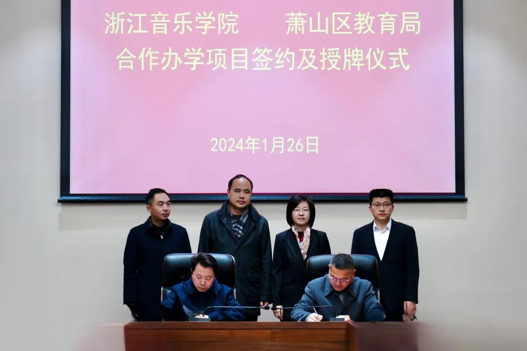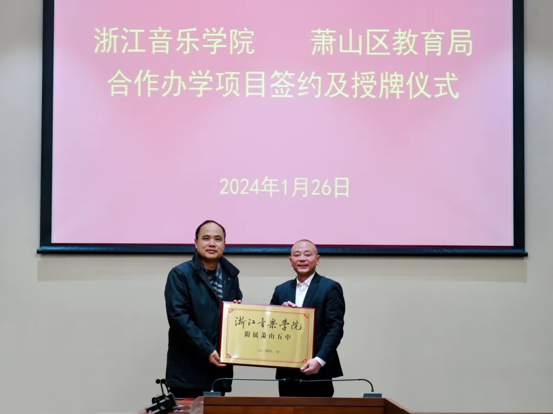 仪式上,双方签订合作办学协议,启动“浙江音乐学院附属萧山五中”共建项目。王均寅为萧山五中授牌。