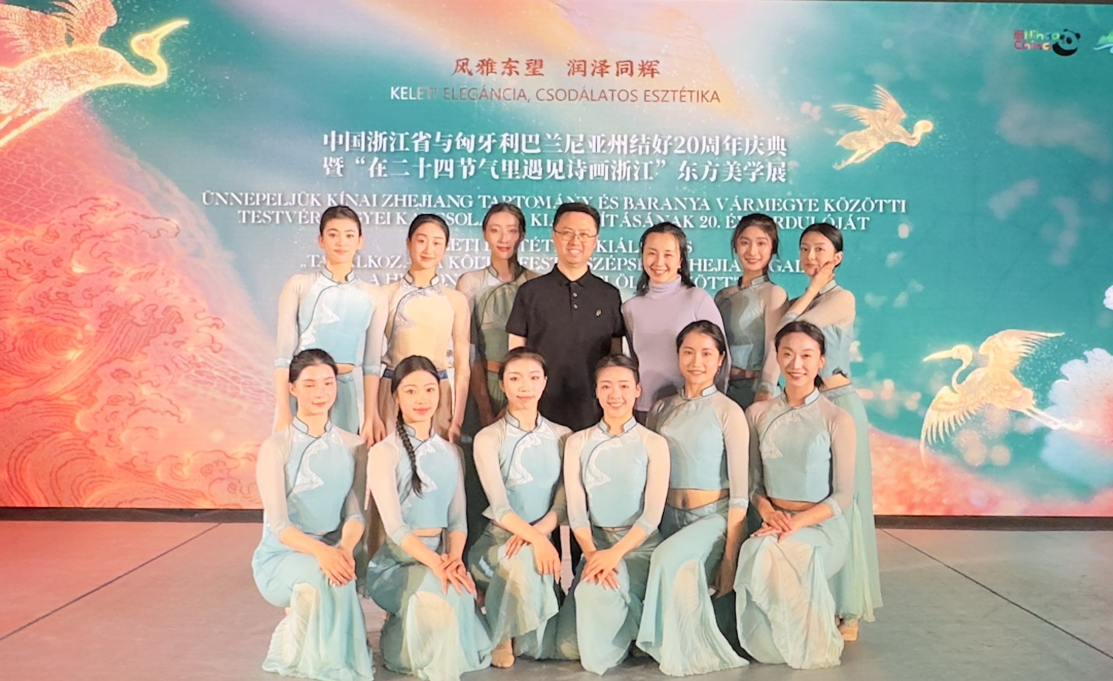 晨曦微露,多瑙河如一条银色的丝带,轻轻缠绕在匈牙利的大地之上。浙江音乐学院舞蹈团一行13人抵达了多瑙河畔的明珠布达佩斯,并前往巴兰尼亚州的州府佩奇市,参加5月15日由浙江省人民政府、匈牙利巴兰尼亚州政府主办,浙江省文化广电和旅游厅和浙江省人民政府外事办公室承办的“风雅东望·润泽同辉——‘在二十四节气里遇见诗化浙江’东方美学展”开幕式,带来经典舞蹈《碇步桥》。