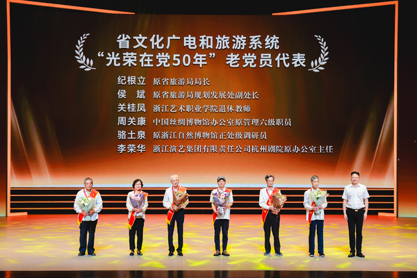 演出前,举行了省级文化广电和旅游厅系统“两优一先”、先锋支部颁奖仪式,陈广胜为老党员代表颁发“光荣在党50年”纪念章,代表厅党组向6位“光荣在党50年”的老党员致以崇高敬意,向受到表彰的先进集体和优秀个人表示热烈祝贺,向厅系统广大党员致以节日的问候。