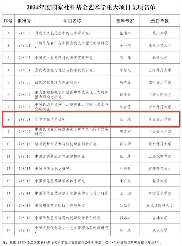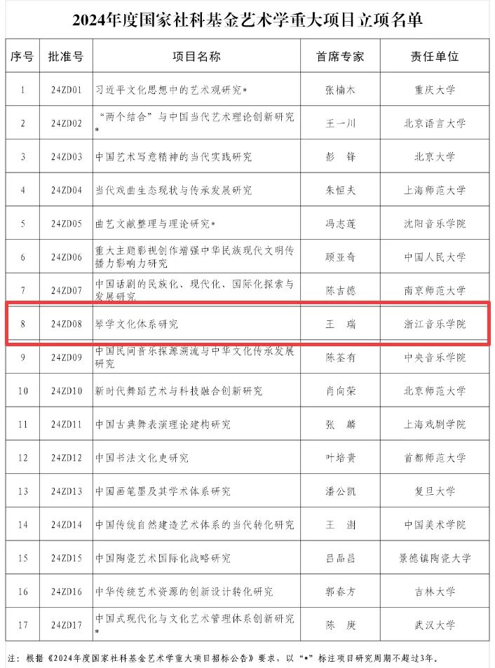 近日,文化和旅游部科技教育司、全国艺术科学规划领导小组办公室发布《2024年度国家社科基金艺术学重大项目立项名单》,由王瑞院长担任首席专家的《琴学文化体系研究》获得立项,批准号为24ZD08。