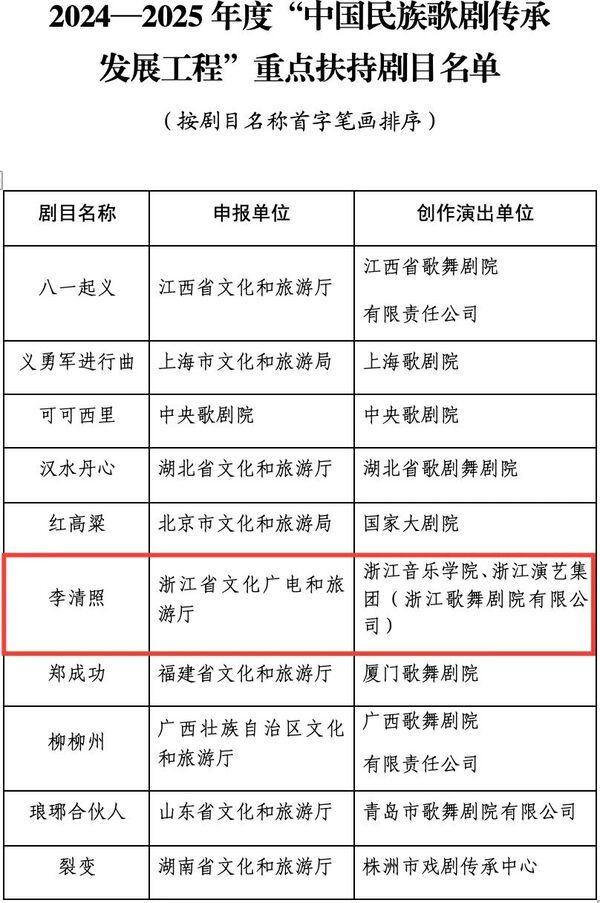 近日,由浙江音乐学院和浙江演艺集团(浙江歌舞剧院)联合创演的民族歌剧《李清照》入选文化和旅游部2024—2025年度“中国民族歌剧传承发展工程”重点扶持剧目,这是我校原创歌剧首次入选。