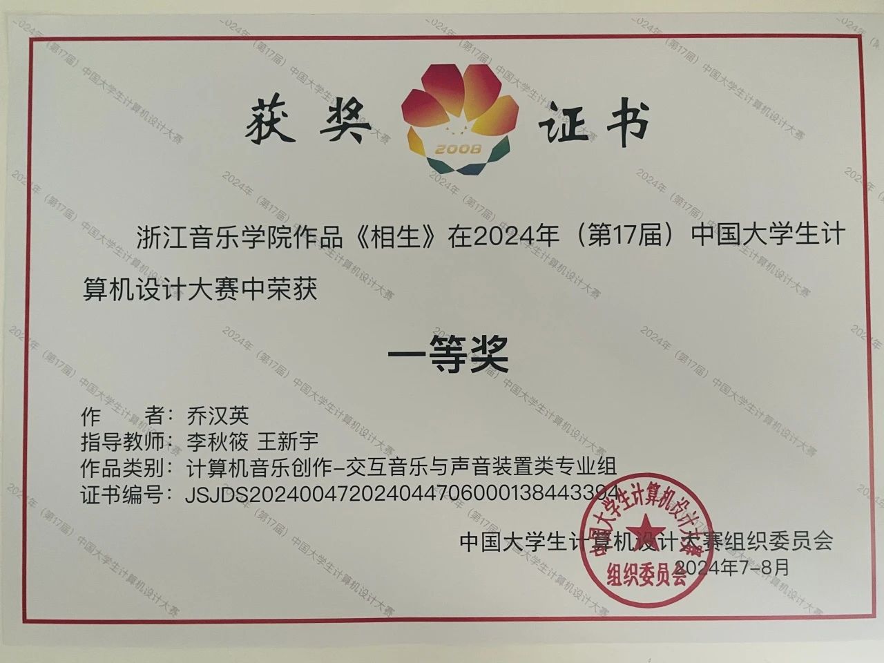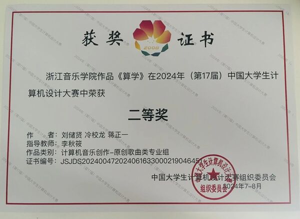 近日,2024年(第17届)中国大学生计算机设计大赛“信息可视化设计/计算机音乐创作”赛道决赛圆满落幕。经过激烈角逐,学校学生凭借扎实的专业知识、创新的思维能力和精湛的实践技能,在全国众多优秀作品中脱颖而出。其中,2021级艺术与科技学生乔汉英交互音乐作品《相生》荣获一等奖(指导老师:李秋筱、王新宇),2022级音乐设计与制作学生刘储贤、蒋正一原创歌曲作品《算学》荣获二等奖(指导老师:李秋筱),2020级音乐设计与制作专业学生毕逸飞原创音乐作品《经纶韵》荣获三等奖(指导老师:姜超迁)。